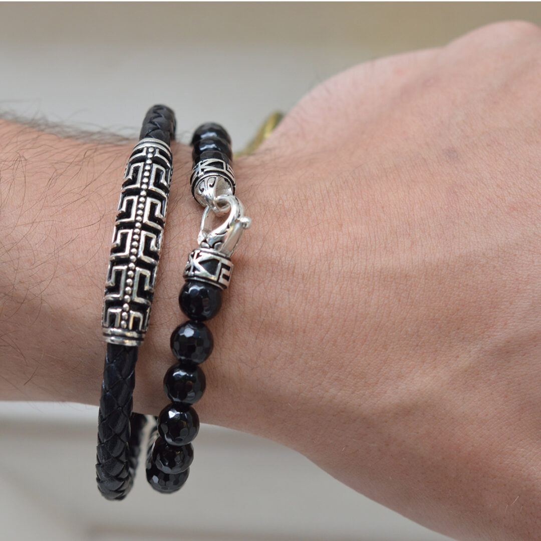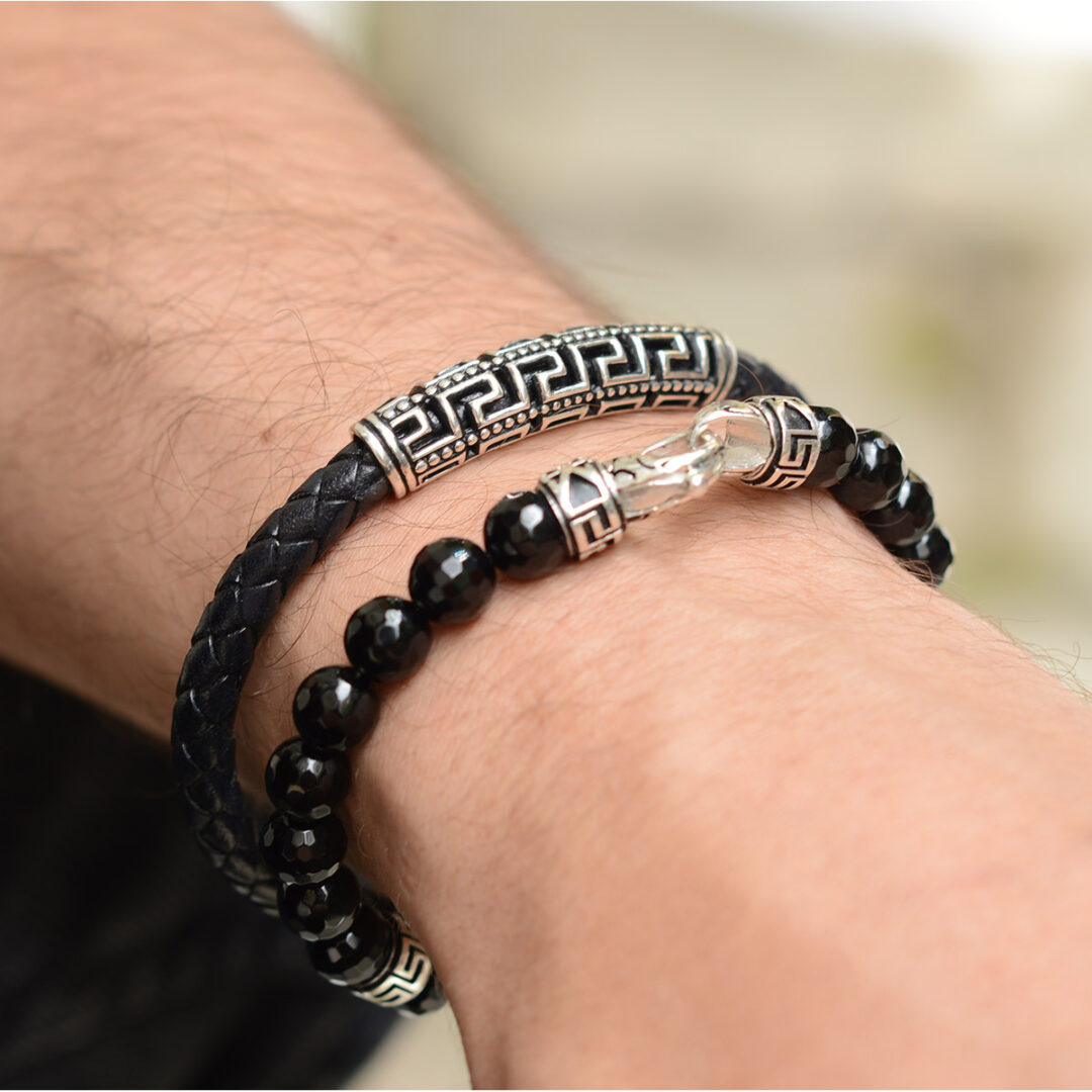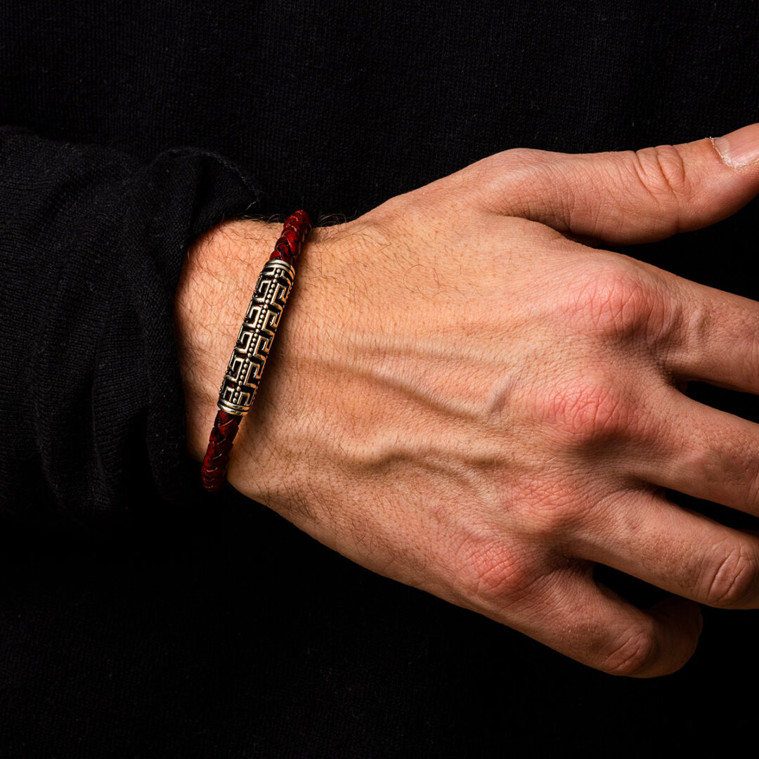 Meander Leather Bracelet – 925 Sterling Silver. Bracelet with Sterling Silver double Greek key motif and 5mm braided genuine leather. Handmade item.