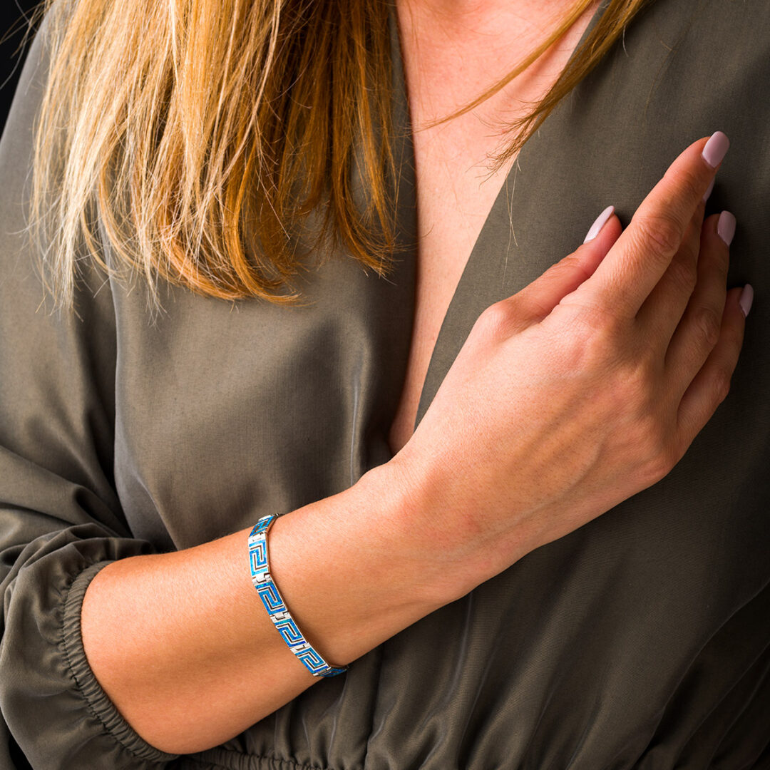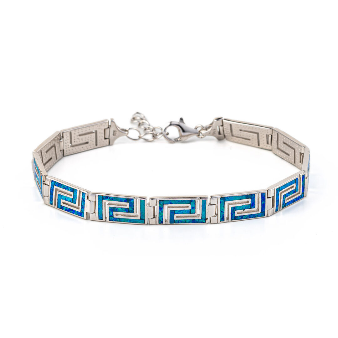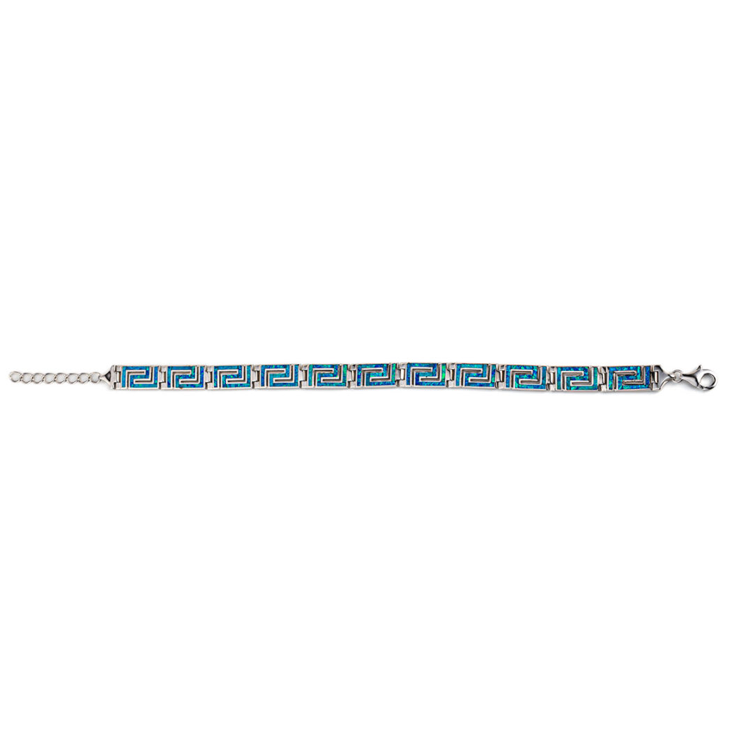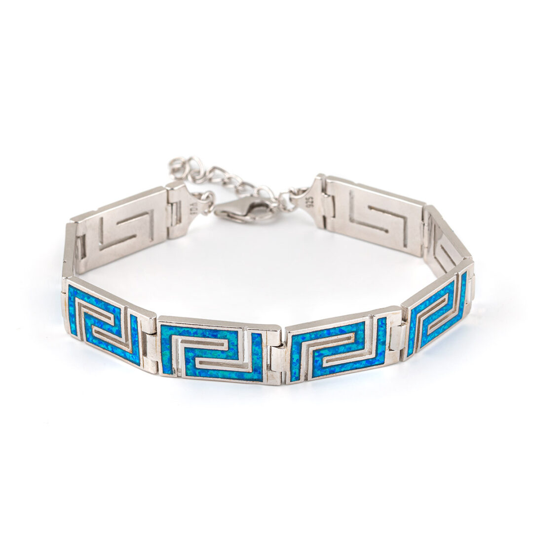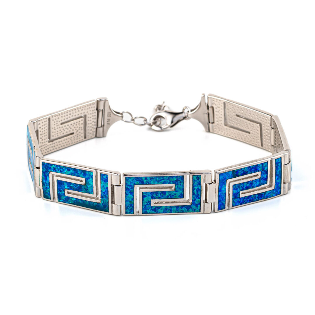 A sterling silver bracelet featuring the meander symbol with blue opal stones.