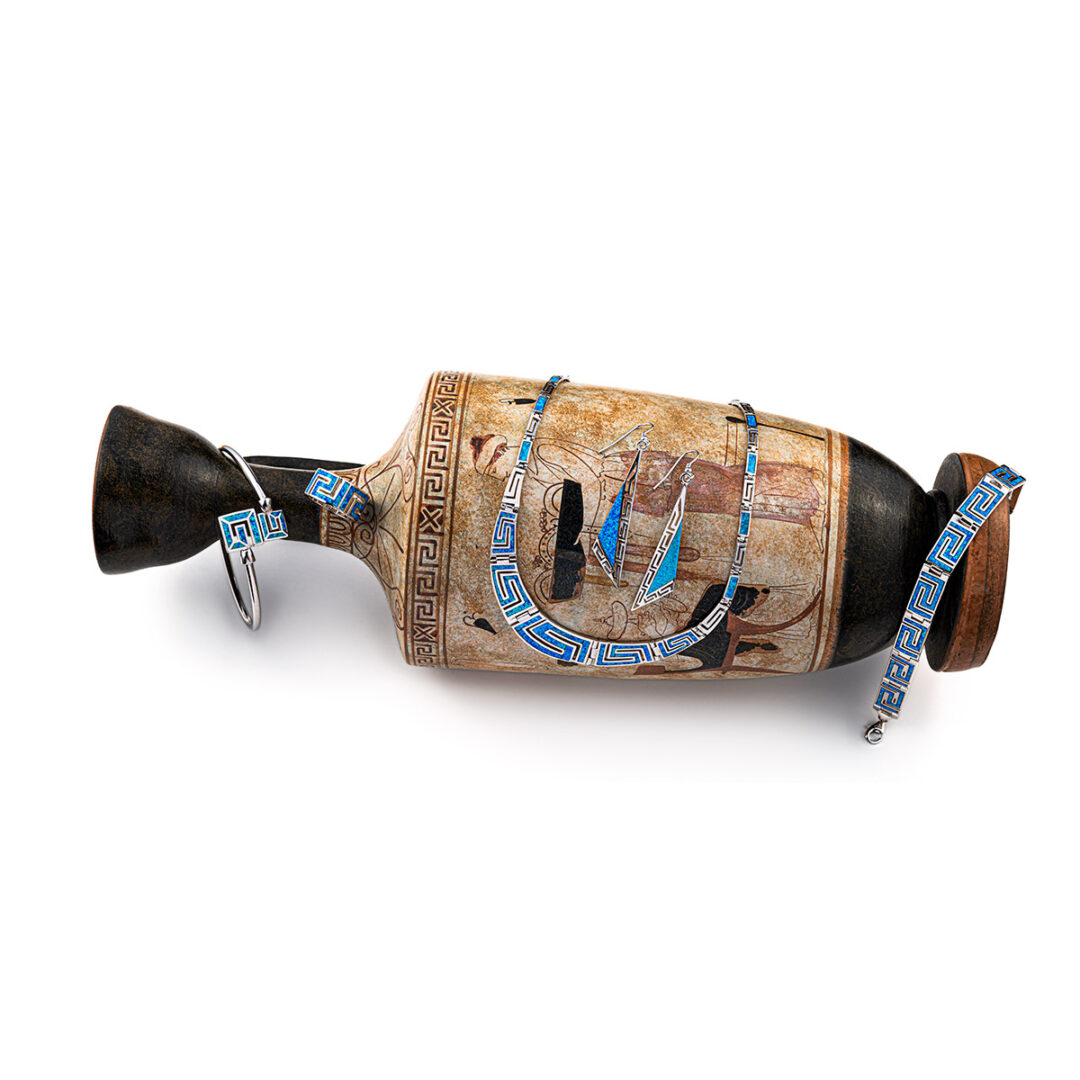 Meandros design is a decorative border constructed from a continuous line, shaped into a repeated motif. Such a design is also called the Greek fret or Greek key design, although these are modern designations. One the one hand, the name “meander” recalls the twisting and turning path of the Meander River in Asia Minor, and on the other hand, as Karl Kerenyi pointed out, “the meander is the figure of a labyrinth in linear form” the meaning is that these is no beginning and to end end in some cases so it become the symbol of long life and eternity.