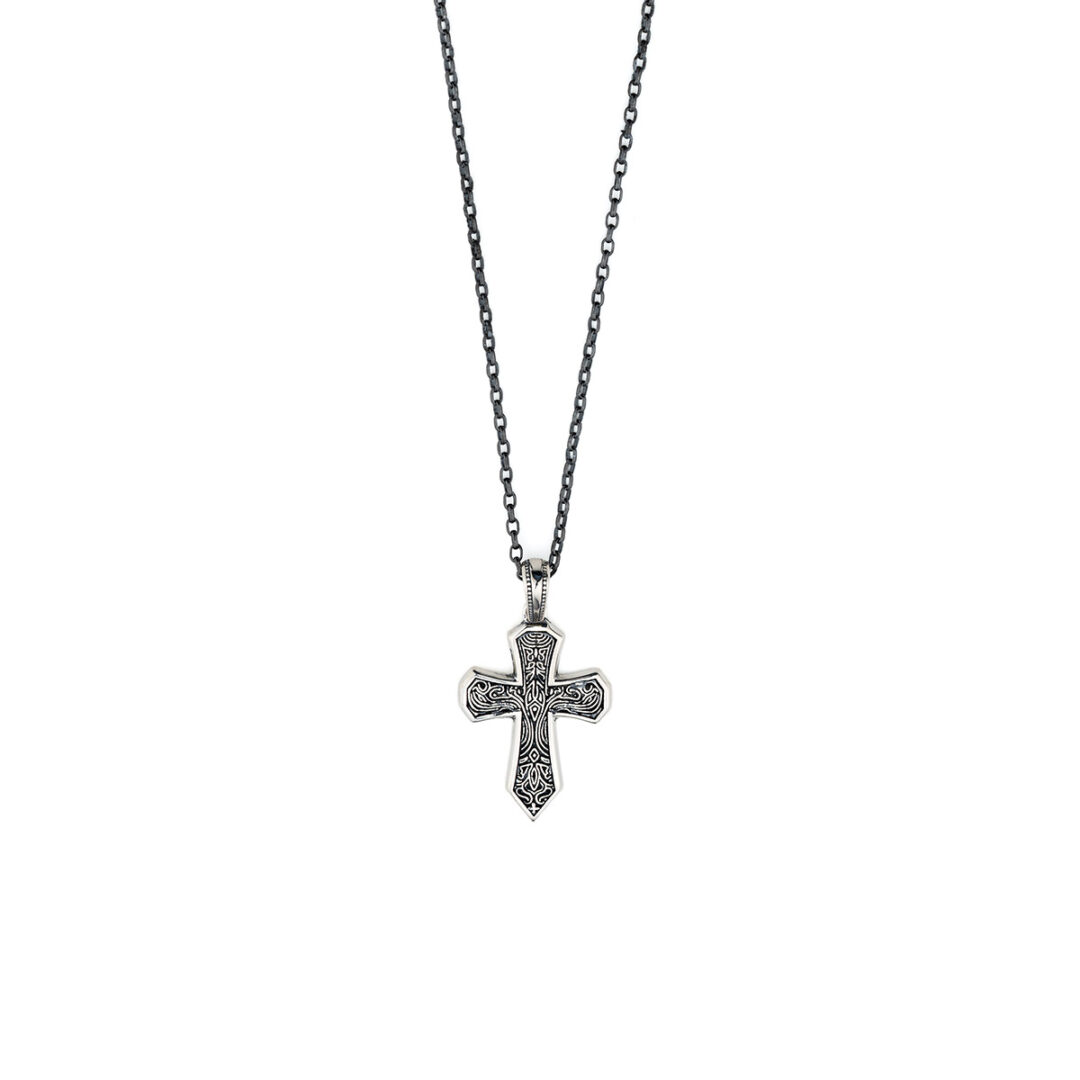Impressive men’s cross pendant with an original handcrafted chain, made of oxidized 925 sterling silver.