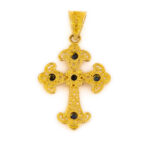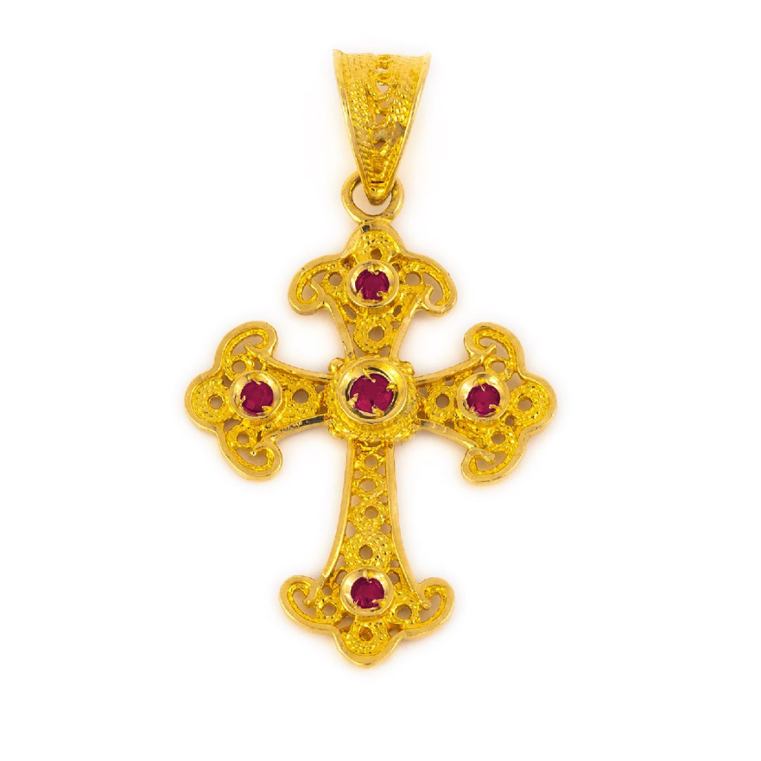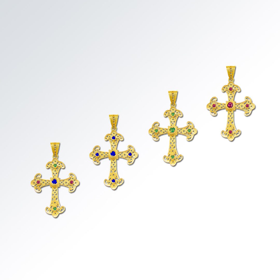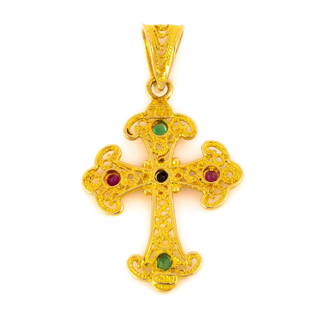 Byzantine Cross decorated with rubies, emeralds and sapphires, granules of precious metal and fine filigree. Choose among emeralds, rubies, sapphires or multi-precious stones.