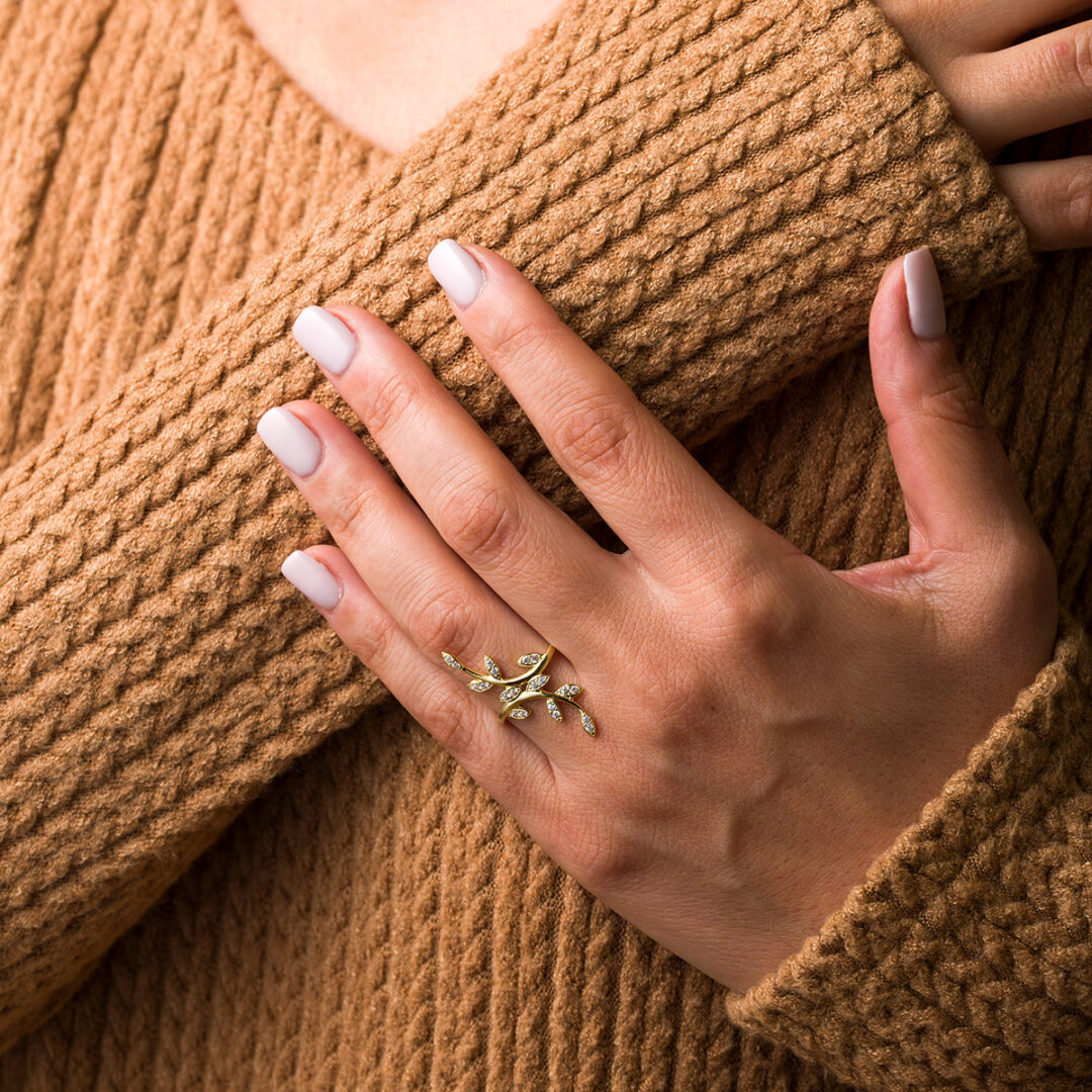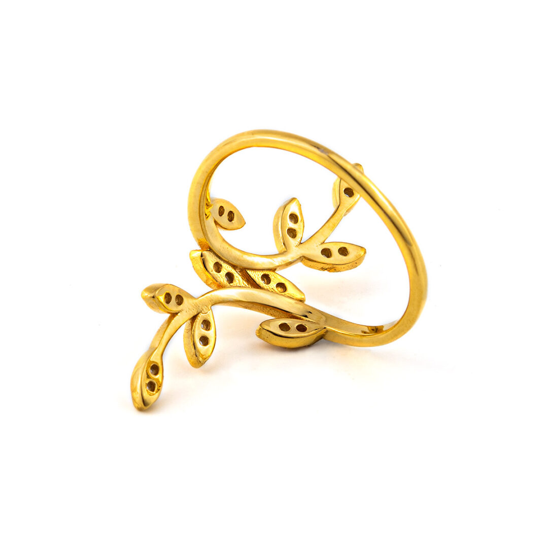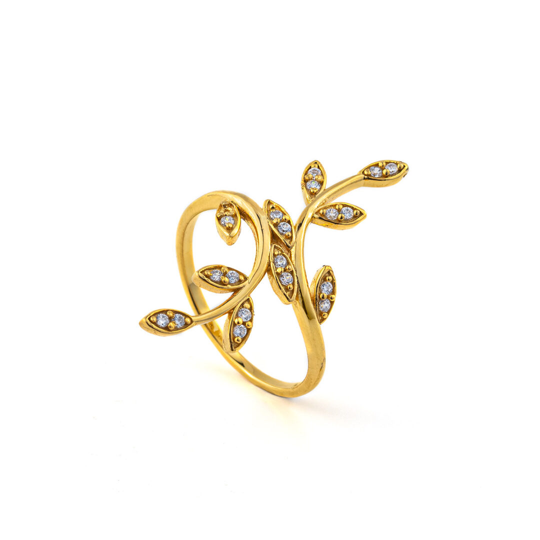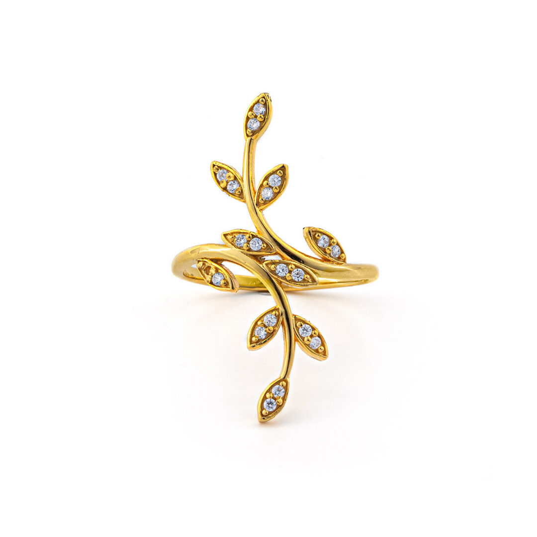 Olive Leaf Ring with Zircon – 14K Solid Yellow Gold