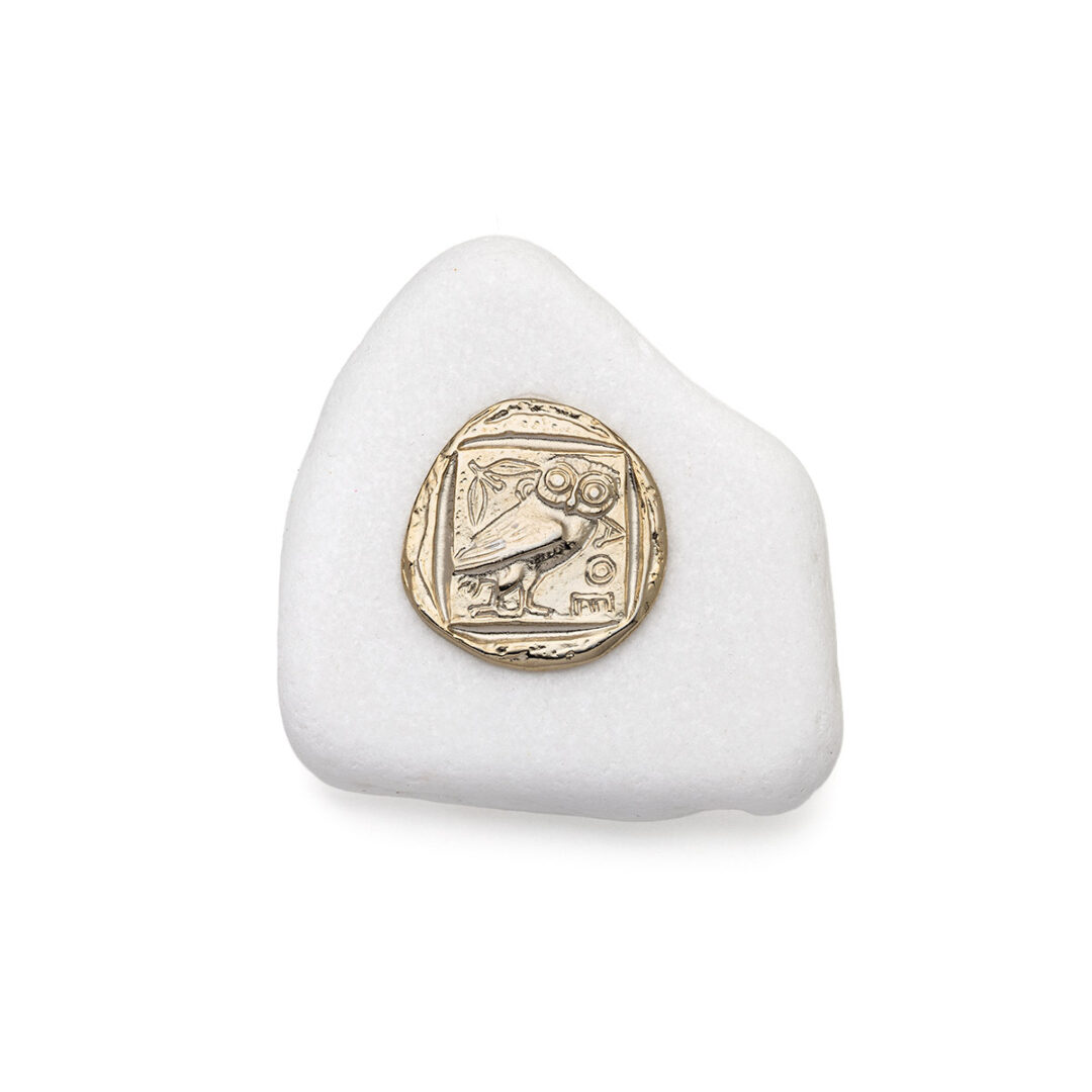 Gold-plated owl decorative piece, elegantly set on a polished Thassos marble base. The owl, sacred symbol of Athena, represents wisdom, knowledge, insight, and protection, making it a timeless emblem in Greek culture.