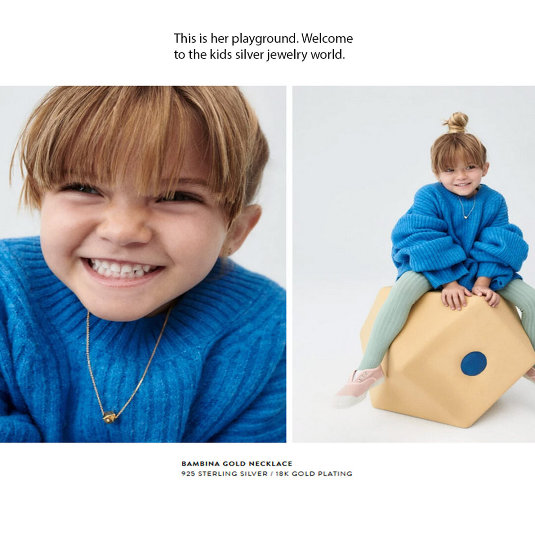 The jewelry in the children’s collection is created with 925 sterling silver with an 18 carat gold plating. Necklaces and earrings that combine different color shades star in a line of silver jewelry for kids that will become the perfect gift for any girl between 3 and 8 years old, her first piece of jewelry for everyday life.