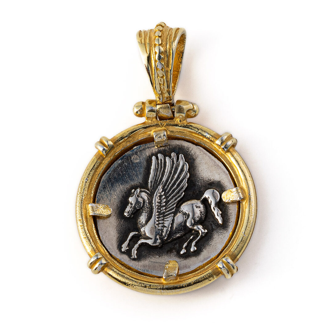 A pendant depicting the horse pegasus. Pegasus is a mythical winged divine stallion, and one of the most recognized creatures in Greek mythology. Usually depicted as pure white, Pegasus is a child of the Olympian god Poseidon.