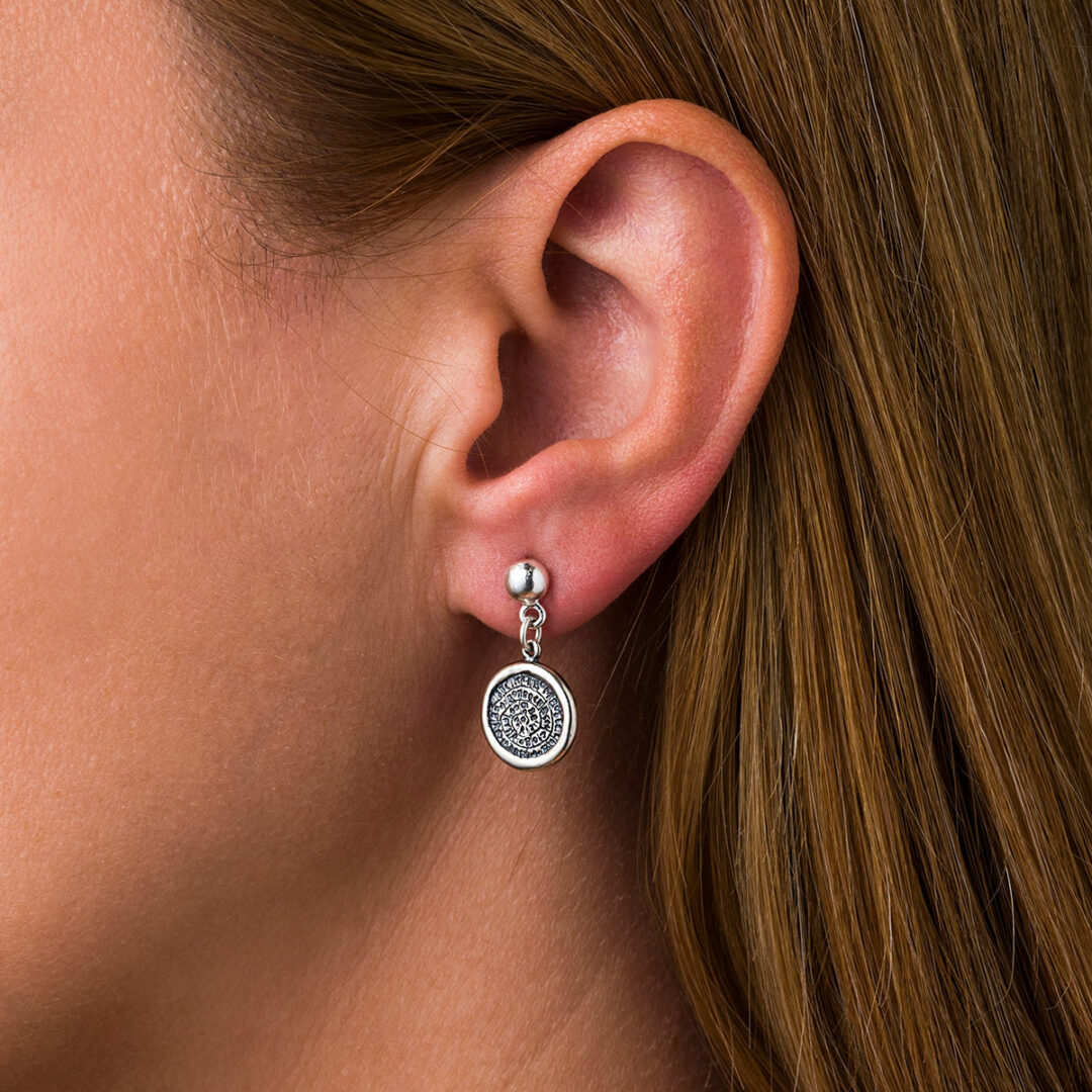This beautiful pair of earrings representing the disc of Phaistos. The Phaistos Disc is a disk of fired clay from the Minoan palace of Phaistos on the island of Crete. Now, the island of Crete is part of modern Greece. The disc was discovered in 1908 by the Italian archaeologist Luigi Pernier in the Minoan palace-site of Phaistos. While it is not clear that it is a script, most attempted decipherments assume that it is; most additionally assume a syllabary, others an alphabet or logography or a calendar, making it one of the most famous mysteries of archaeology. The disk is about 15 cm in diameter and covered on both sides with a spiral of stamped symbols. The disc features 241 tokens, comprising 45 distinct signs, which were apparently made by pressing hieroglyphic “seals” into a disc of soft clay, in a clockwise sequence spiraling toward the center of the disk. This unique object is now on display at the archaeological museum of Heraklion. Made of 925⁰ sterling silver.