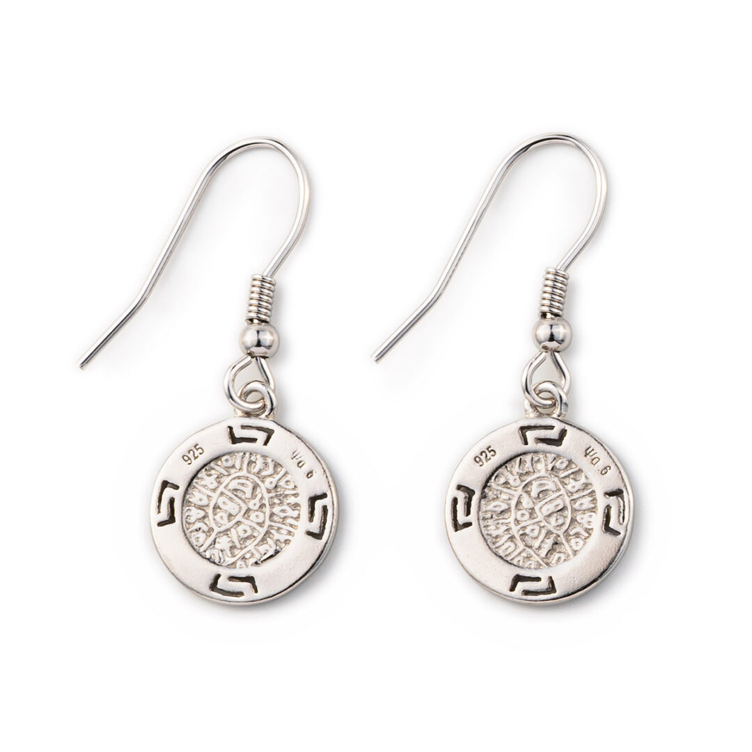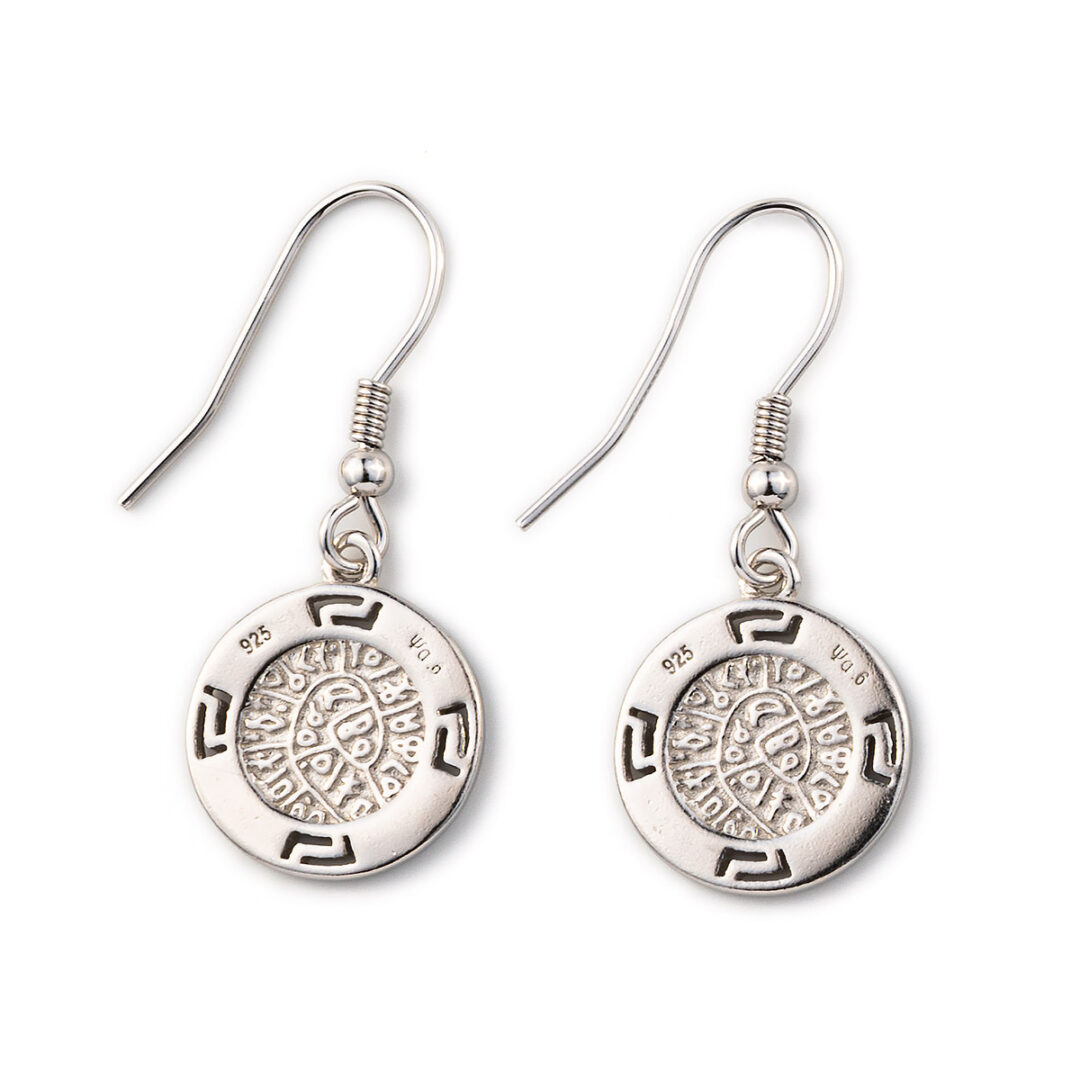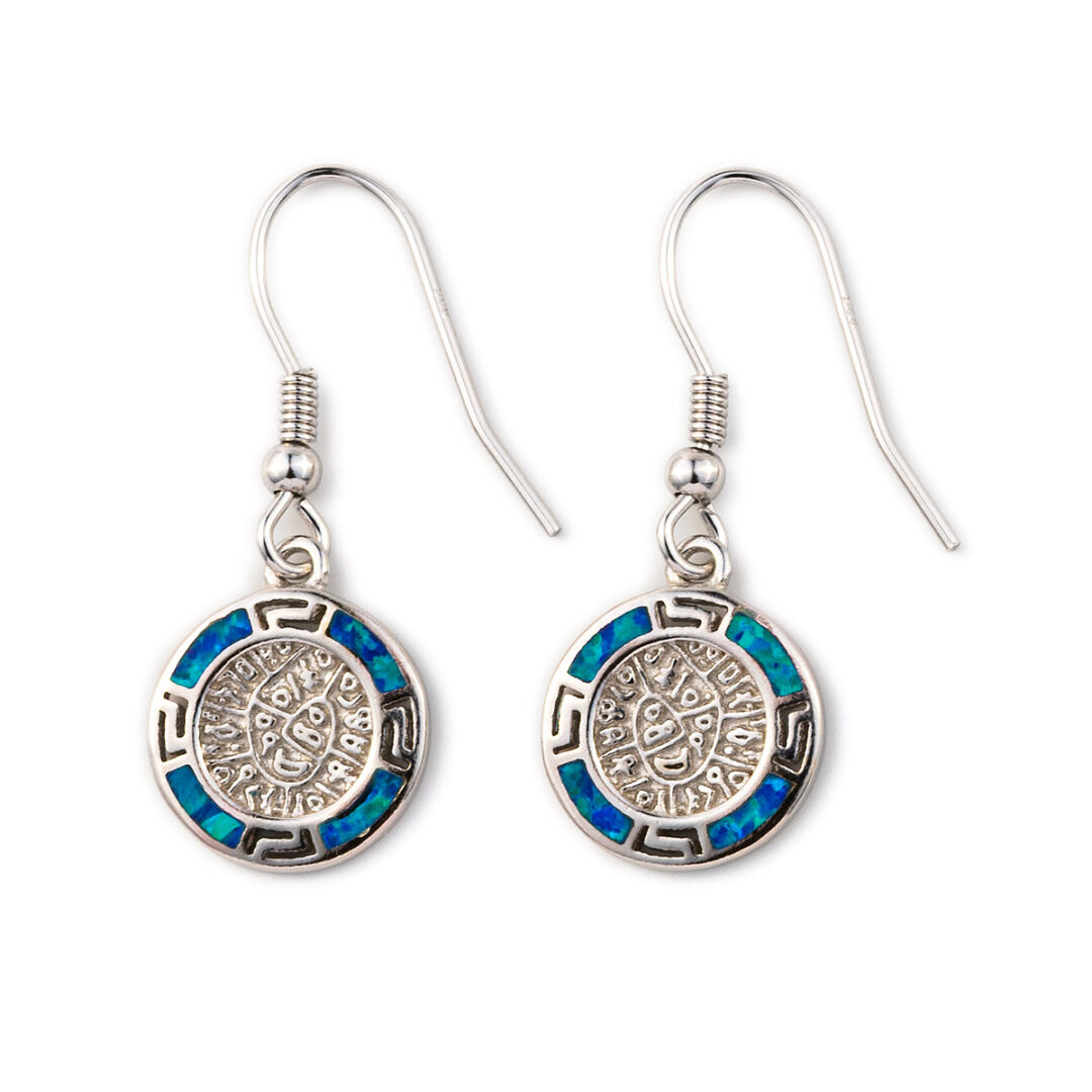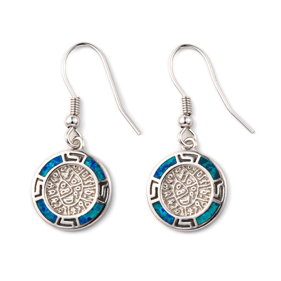 Phaistos Disc Dangle Earrings – 925 Sterling Silver with Opal