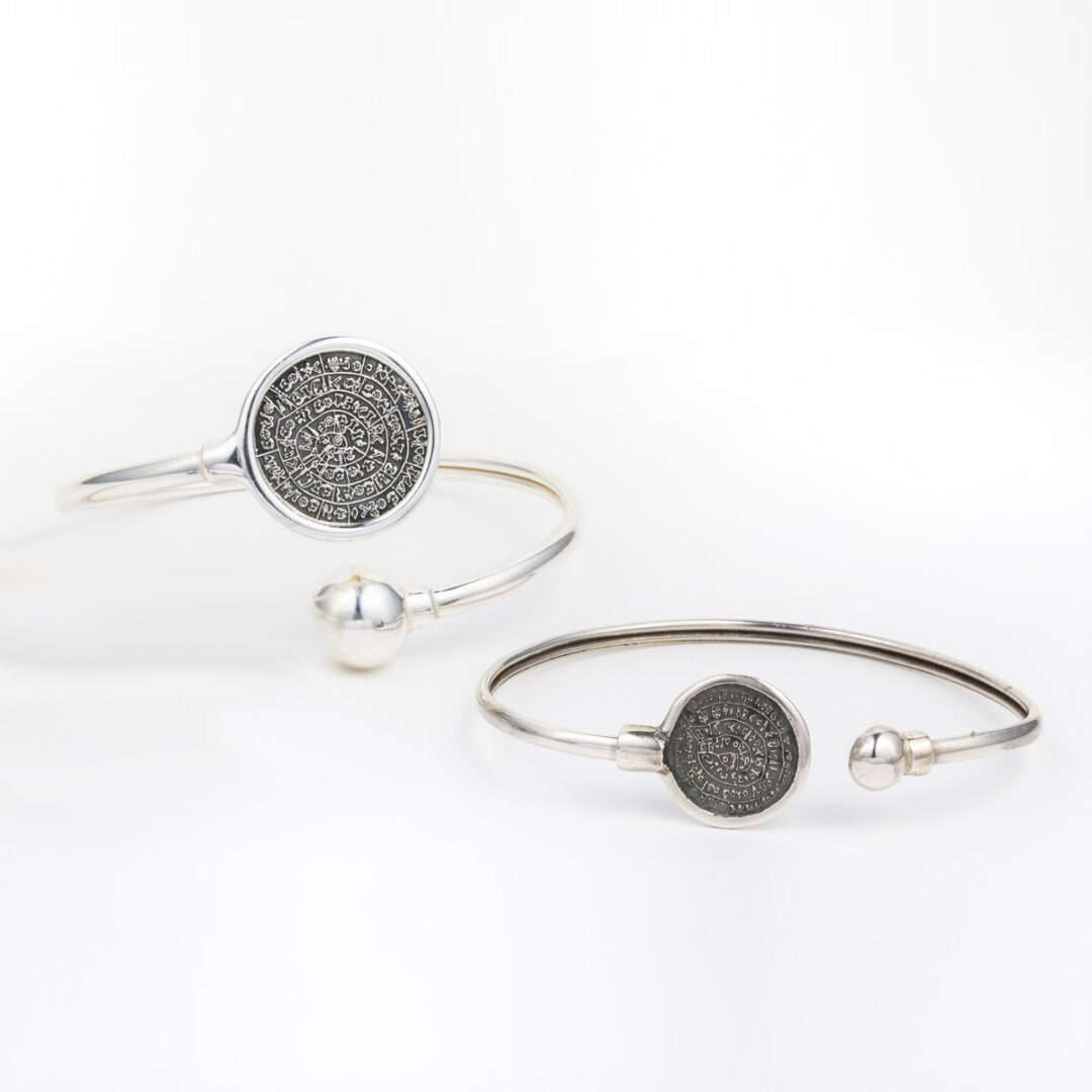 This beautiful silver bracelet representing the disc of Phaistos. The Phaistos Disc is a disk of fired clay from the Minoan palace of Phaistos on the island of Crete. Now, the island of Crete is part of modern Greece. The disc was discovered in 1908 by the Italian archaeologist Luigi Pernier in the Minoan palace-site of Phaistos. While it is not clear that it is a script, most attempted decipherments assume that it is; most additionally assume a syllabary, others an alphabet or logography or a calendar.