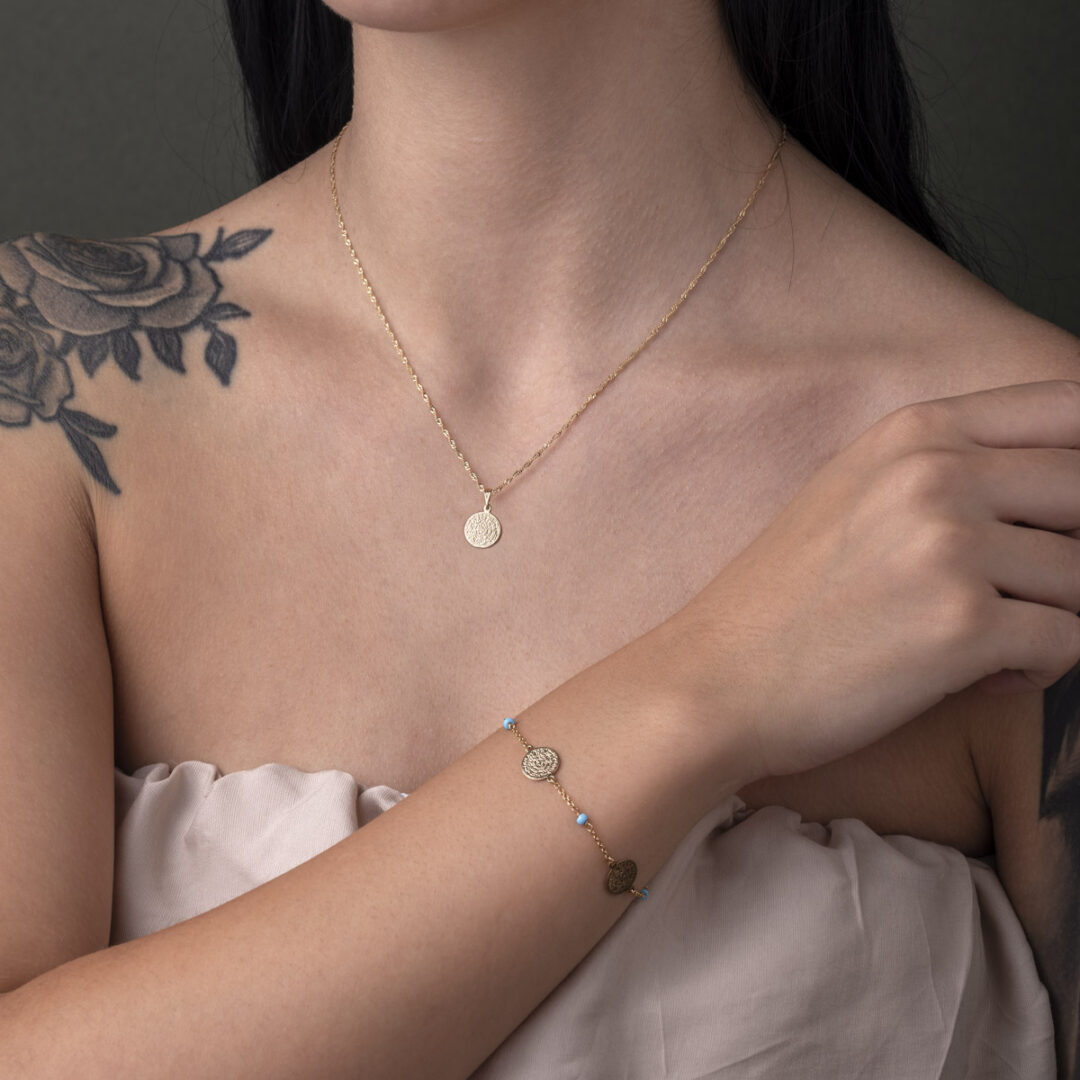 The model is wearing the pendant in size small – diameter 1 cm (0.39″)