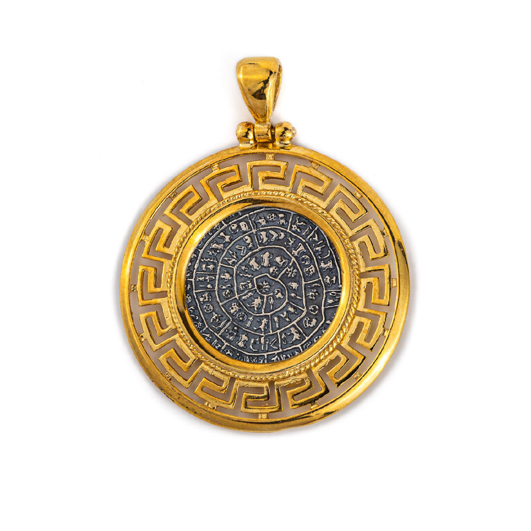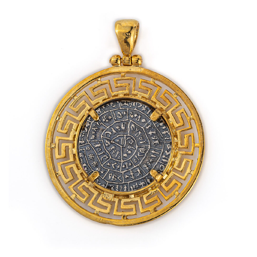 Phaistos Disc pendant with Greek Key symbol. The Phaistos Disc is a disk of fired clay from the Minoan palace of Phaistos on the island of Crete. Now, the island of Crete is part of modern Greece. The disc was discovered in 1908 by the Italian archaeologist Luigi Pernier in the Minoan palace-site of Phaistos. While it is not clear that it is a script, most attempted decipherments assume that it is; most additionally assume a syllabary, others an alphabet or logography or a calendar.