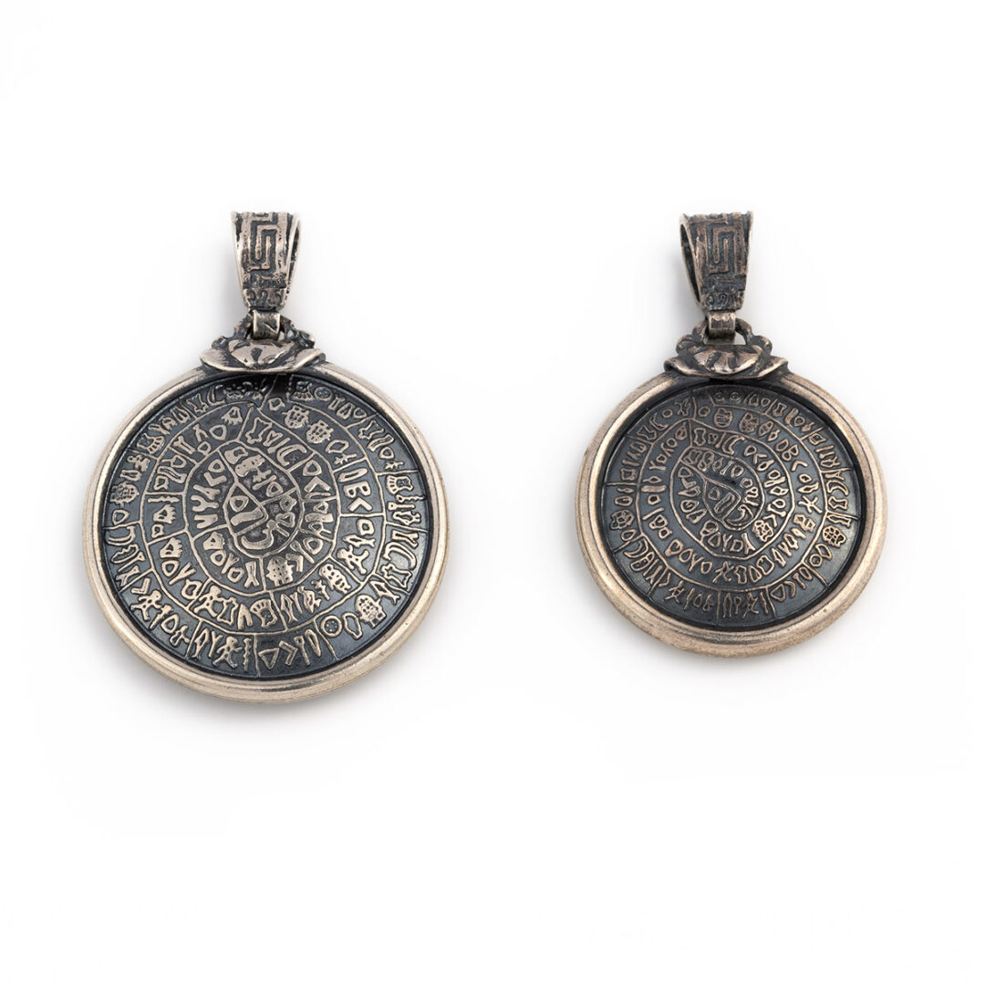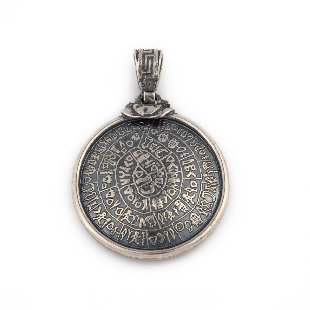 The Phaistos Disc is a disk of fired clay from the Minoan palace of Phaistos on the island of Crete, possibly dating to the middle or late Minoan Bronze Age (second millennium B.C.). The disk is about 15 cm (5.9 in) in diameter and covered on both sides with a spiral of stamped symbols. This unique object is now on display at the archaeological museum of Heraklion.