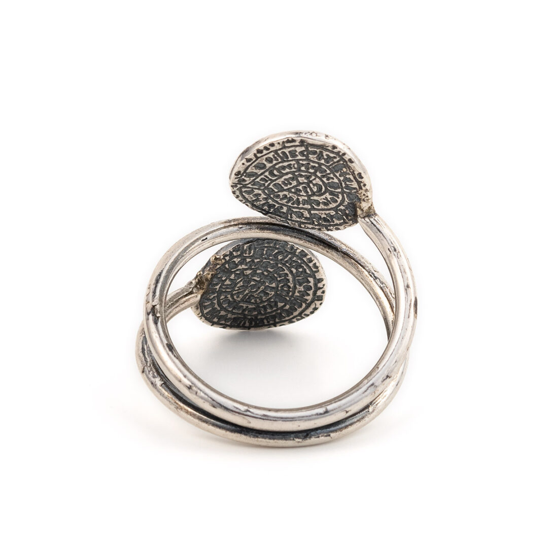 This beautiful silver ring represents the disc of Phaistos. The Phaistos Disc is a disk of fired clay from the Minoan palace of Phaistos on the island of Crete. Now, the island of Crete is part of modern Greece. The disc was discovered in 1908 by the Italian archaeologist Luigi Pernier in the Minoan palace-site of Phaistos. While it is not clear that it is a script, most attempted decipherments assume that it is; most additionally assume a syllabary, others an alphabet or logography or a calendar, making it one of the most famous mysteries of archaeology. The disk is about 15 cm in diameter and covered on both sides with a spiral of stamped symbols. The disc features 241 tokens, comprising 45 distinct signs, which were apparently made by pressing hieroglyphic “seals” into a disc of soft clay, in a clockwise sequence spiraling toward the center of the disk. This unique object is now on display at the archaeological museum of Heraklion.