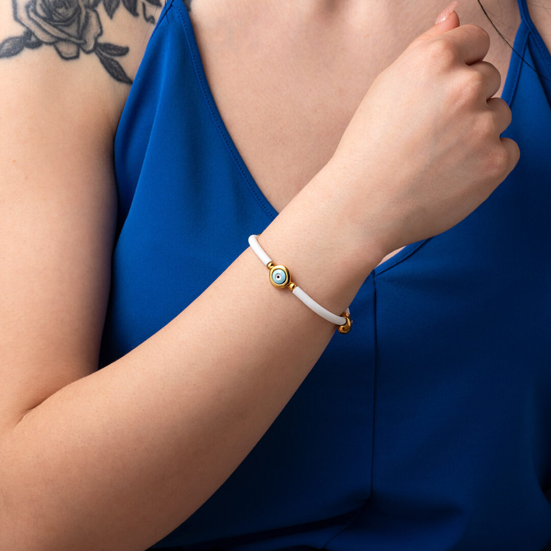 The symbol and superstition of the evil eye is one of the strongest symbolic images in the world. The earliest known evidence for belief in the evil eye goes back to ancient Greece and Rome. It is supposed to wear off evil to anyone who wears it and various cultures believe in that, however in Greece it’s blue because at that time blue eyes were not so common and were thought to give the evil eye, so the blue is like a mirror to them. Nowadays it’s widely known and has become a trend.