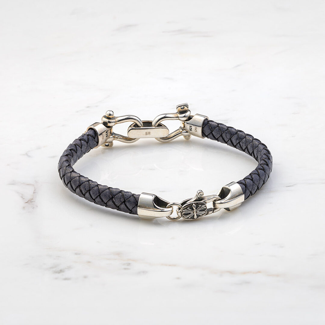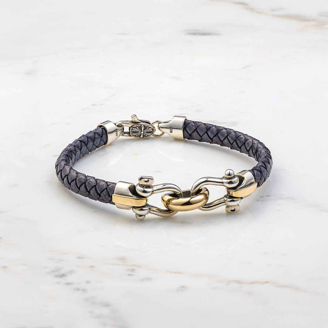 Bracelet with Sterling Silver & K14 Gold double links bracing two sailor’s keys and braided genuine leather.