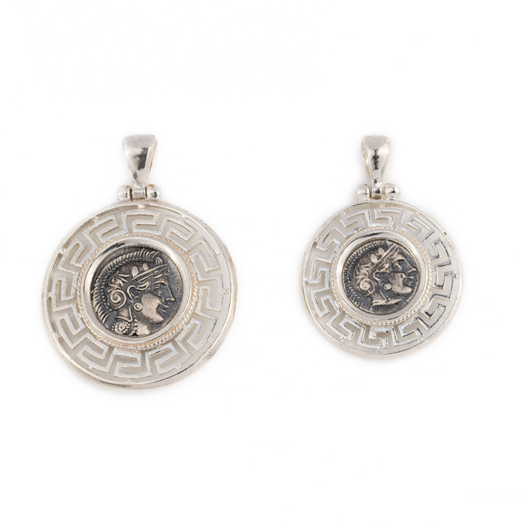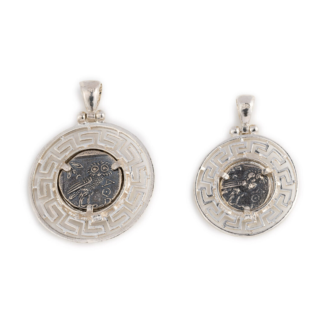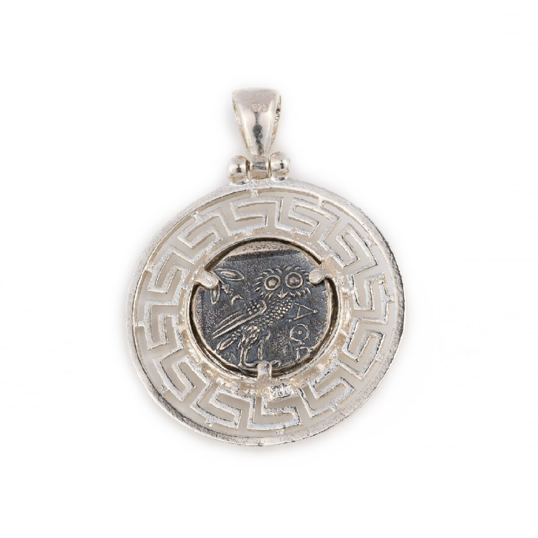 Goddess Athena and Owl – Athenian silver tetradrachm Dracma was the currency used in Greece during several periods in its history. The tetradrachm was an Ancient Greek silver coin equivalent to fourdrachmae in Athens it replaced the earlier “heraldic” type of didrachms and it was in wide circulation from ca. 510 to ca. 38 BC. This coin belongs to the so-called “new style Athenian coins” minted between 166 and 64 B.C. and is considered one of the most popular ancient Greek coins which illustrate the portrait of Goddess Athena on the one side and the wisdom owl on the other. Athena is an ancient Greek goddess associated with wisdom, handicraft, and warfare. Athena was regarded as the patron and protectress of various cities across Greece, particularly the city of Athens, from which she most likely received her name. She’s usually shown in art wearing a helmet and holding a spear. Her major symbols include owls, olive trees, and snakes. Her temples were located atop the fortified Acropolis in the central part of the city. The Parthenon on the Athenian Acropolis is dedicated to her, along with numerous other temples and monuments. Her main festival in Athens was the Panathenaia, which was celebrated in midsummer and was the most important festival on the Athenian calendar. In the classical Olympian pantheon, Athena was regarded as the favorite daughter of Zeus. The owl traditionally accompanies Athena. Because of such association, the owl has been used as a symbol of knowledge and wisdom. The inscriptions contain the city’s “national” appellation (“ΑΘΕ», i.e. “of the Athenians”).
