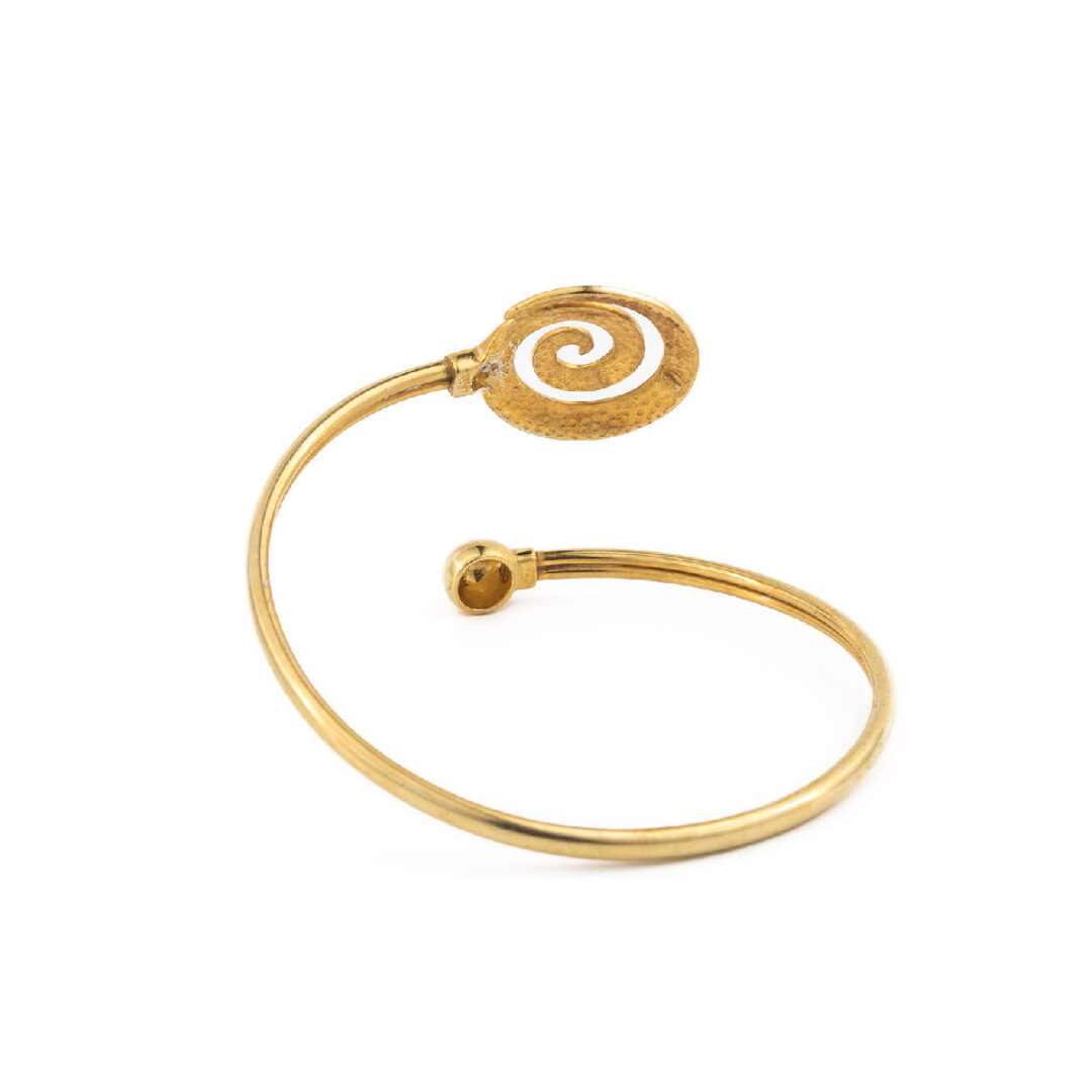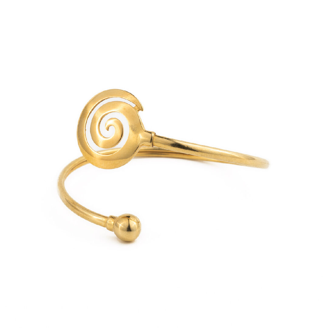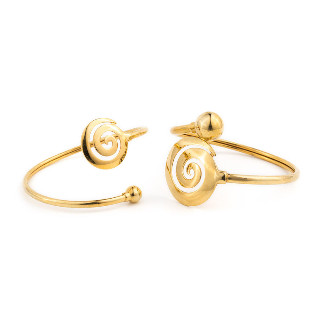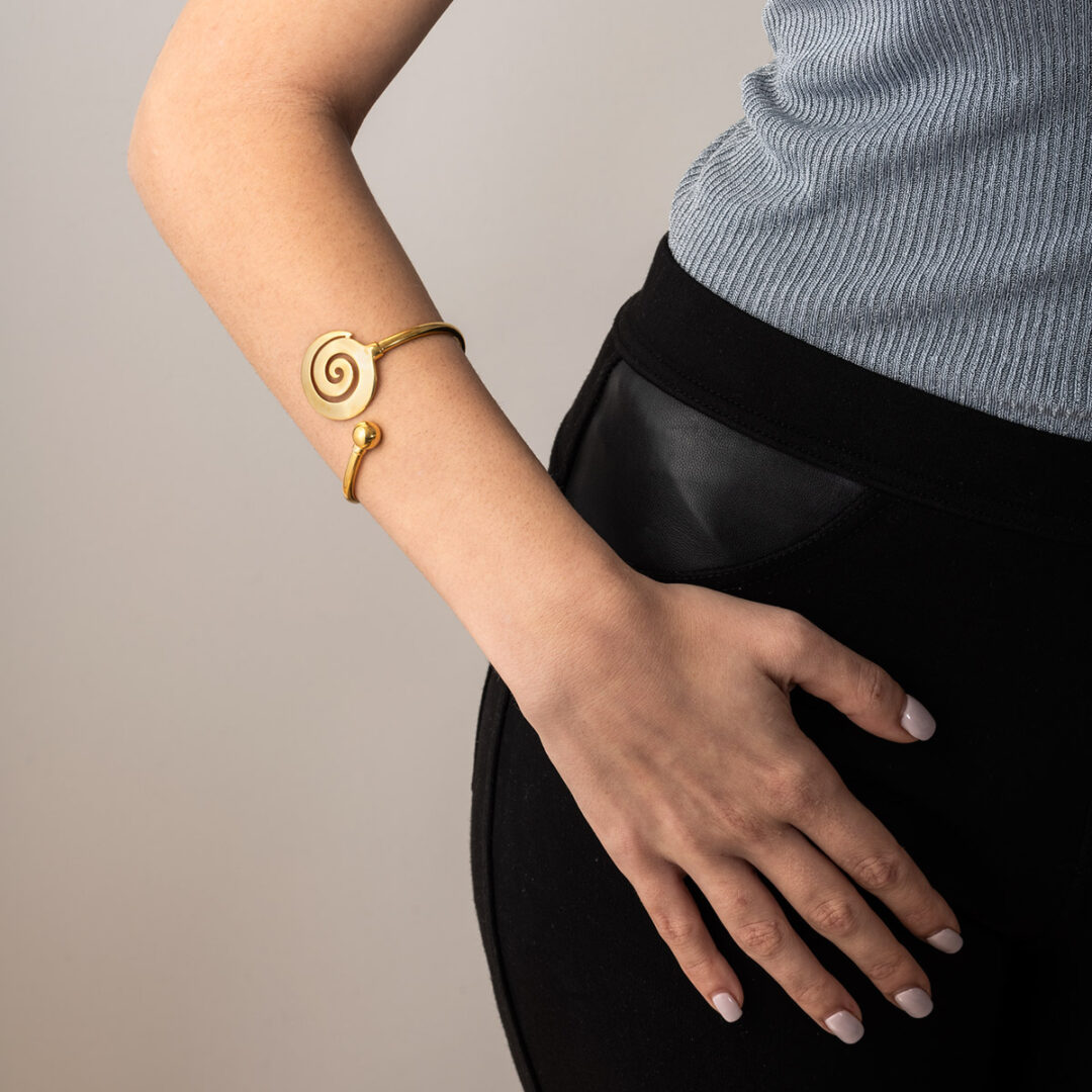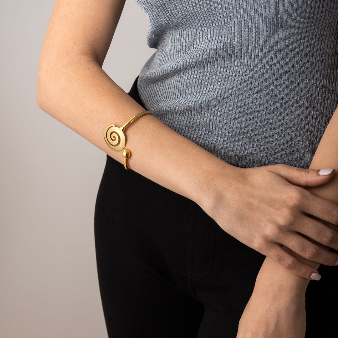Gold Plated Bangle Bracelet with spiral design. The spiral is one of the oldest symbols of human spirituality, carved or painted into rocks thousands of years ago. Symbol of movement and progressive development, growth, expansion, cosmic energy, symbol of the sun. Spirals have been found in burial sites, in vases, in jewelry, clothing, weapons… They can be seen in every aspect of nature, like the tides in the oceans, the winds, the plants, and the shells. The spiral phenomenon has been explained through mathematics from the time of Archimedes, the great Greek mathematician.