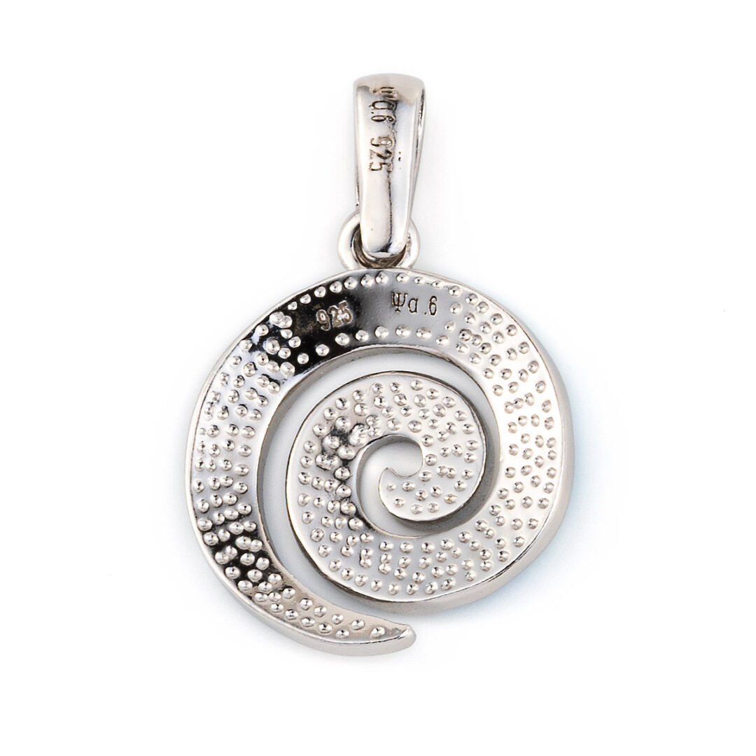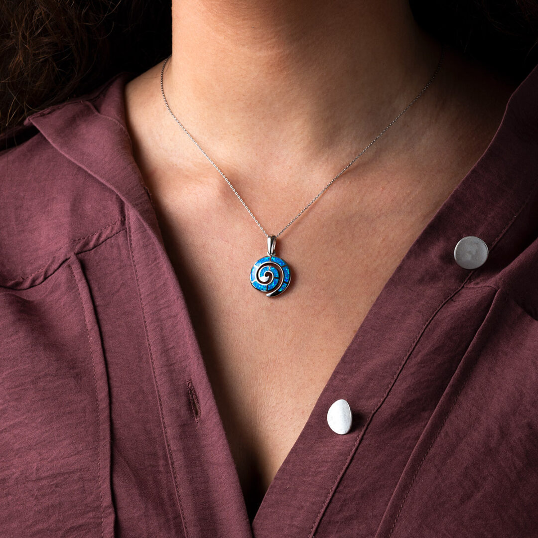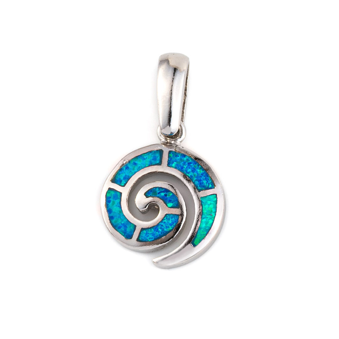A sterling silver pendant featuring the spiral symbol with a blue opal stone.