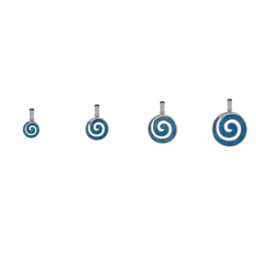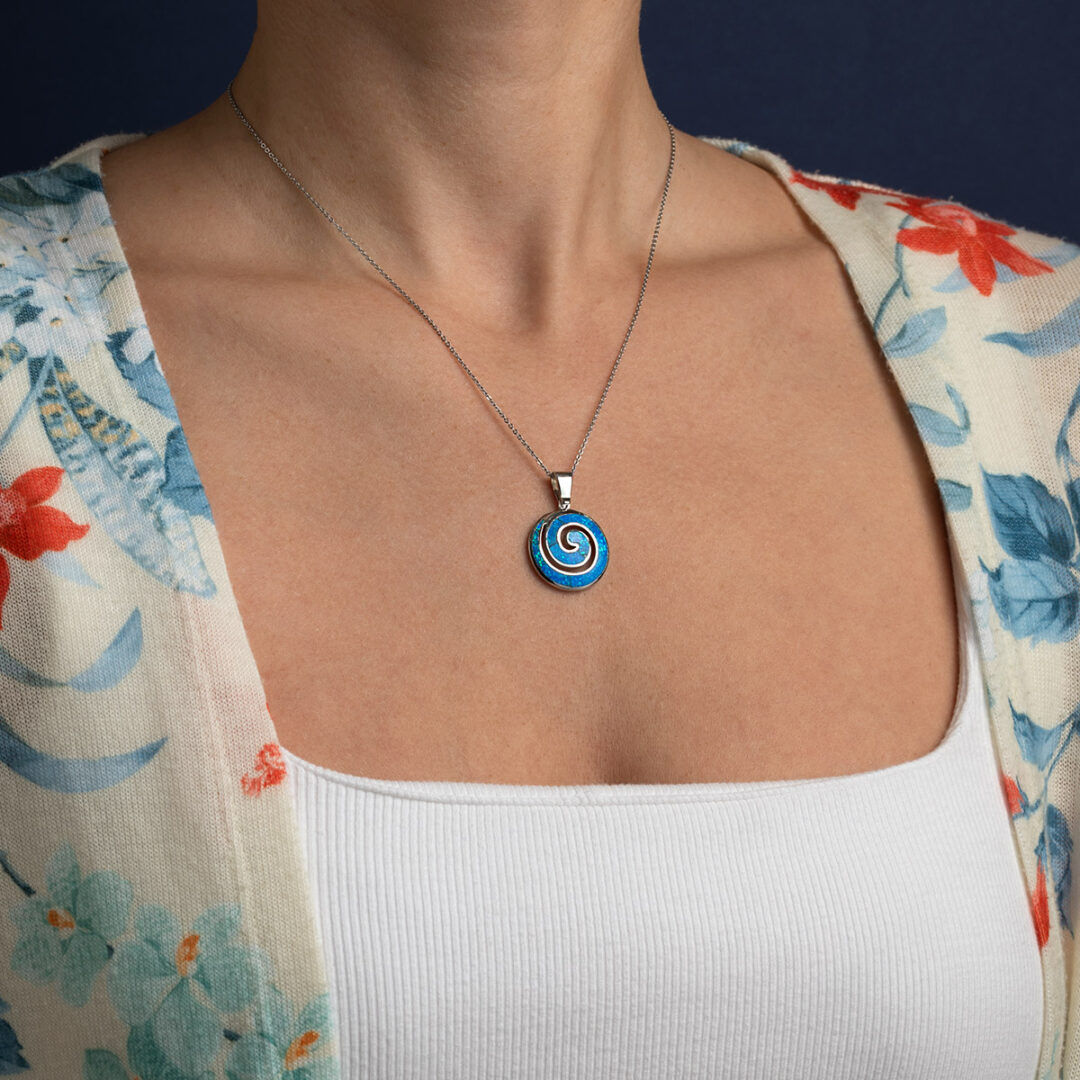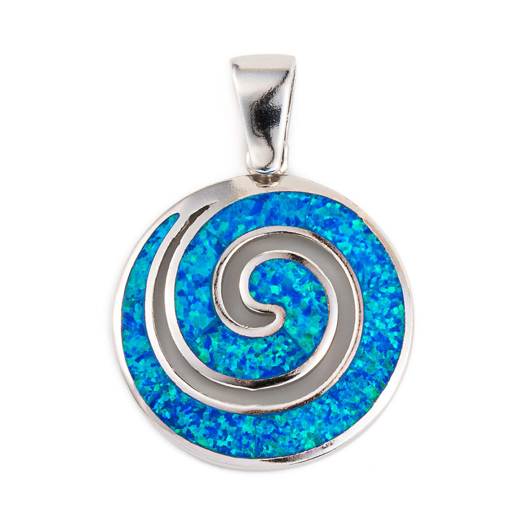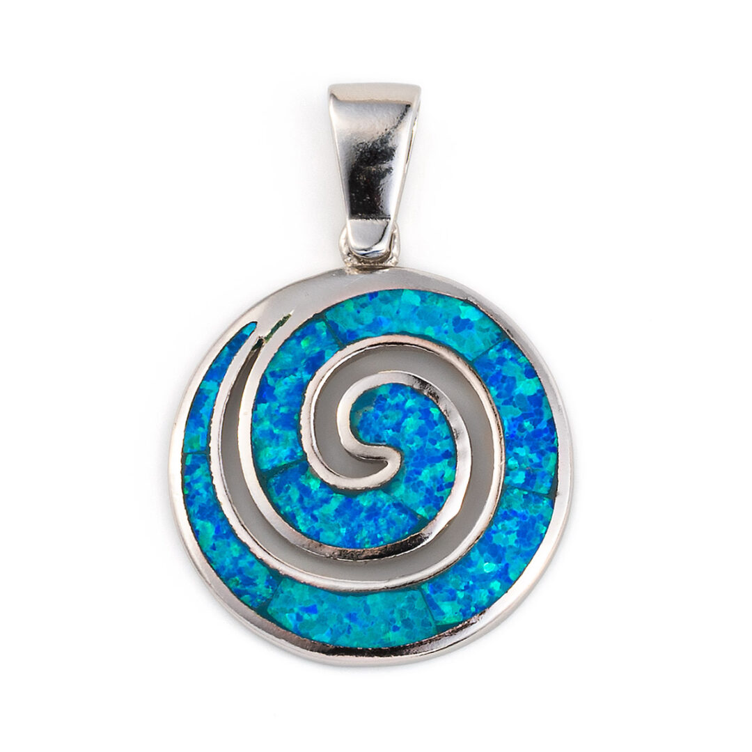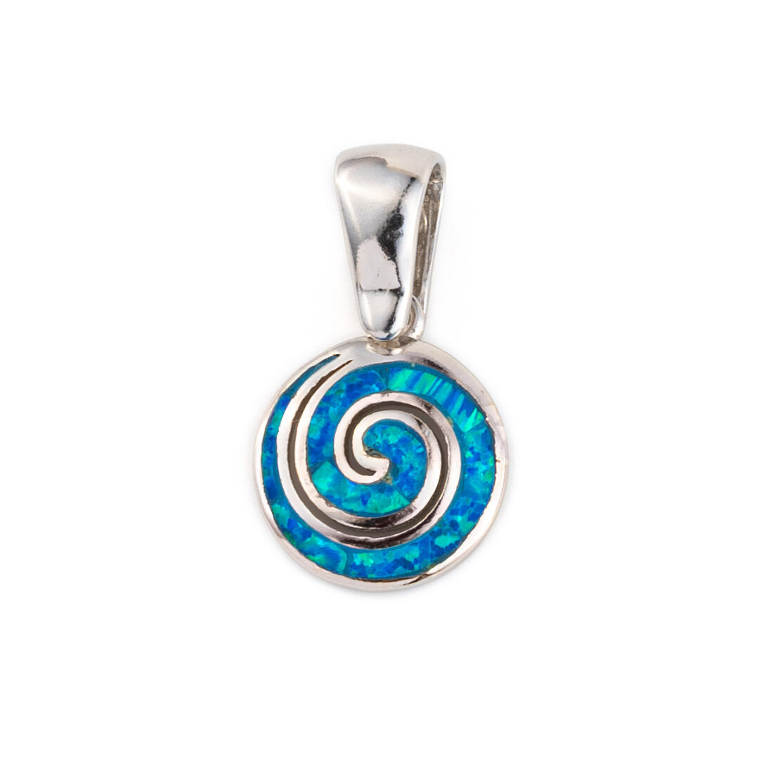 A sterling silver pendant featuring the spiral symbol with a blue opal stone.