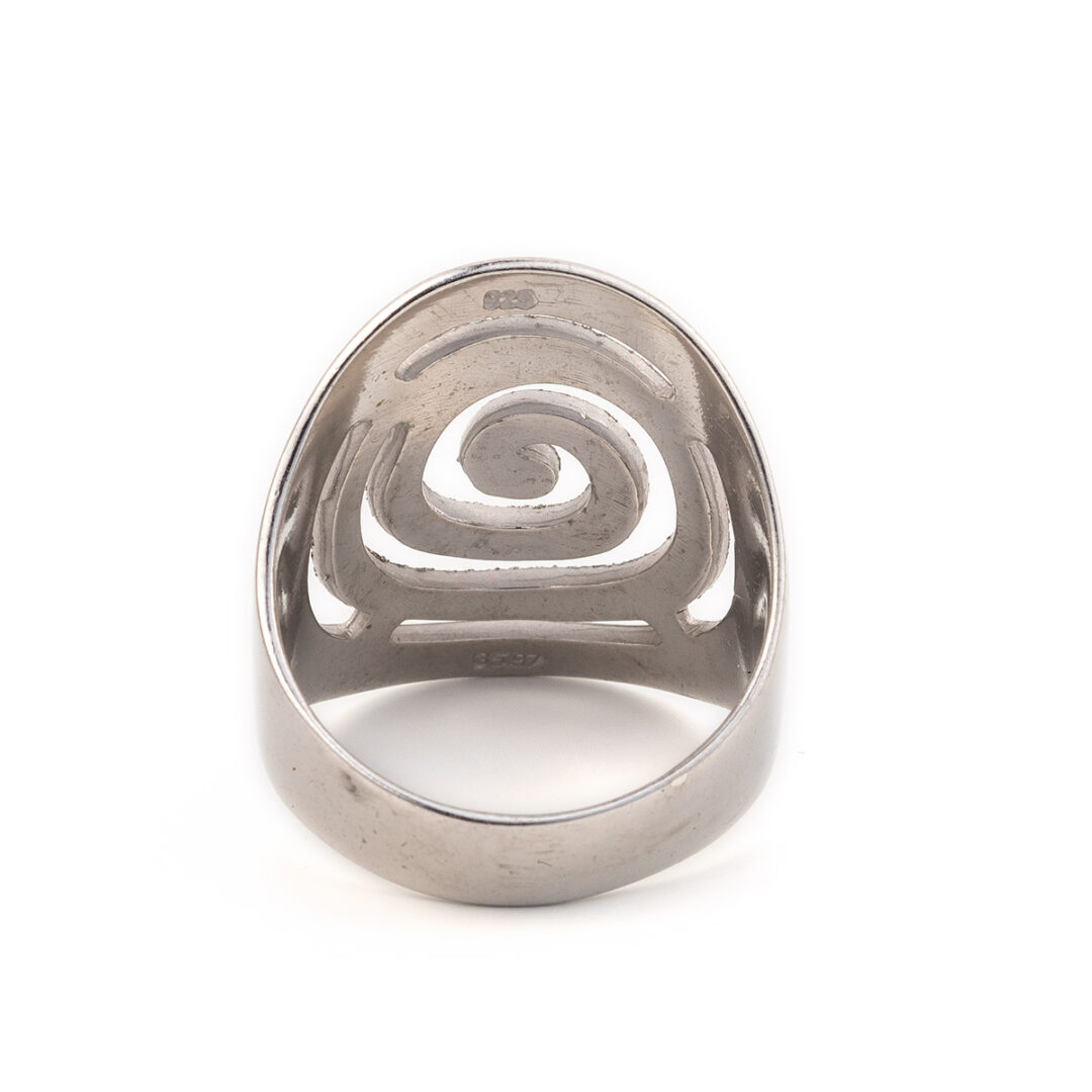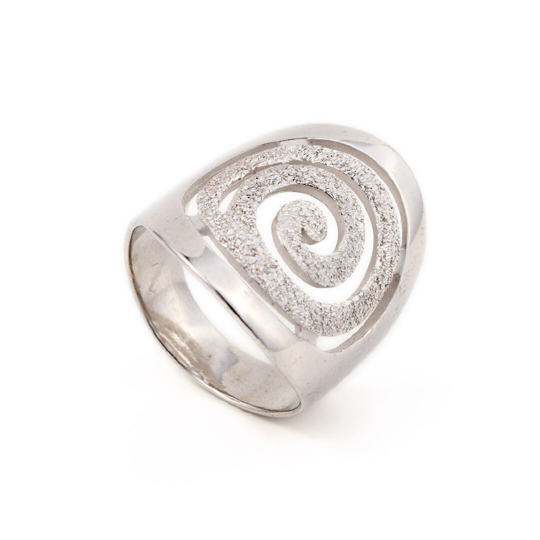 A beautiful silver ring inspired by the spiral symbol. The spiral is one of the oldest symbols of human spirituality, carved or painted into rocks thousands of years ago. Symbol of movement and progressive development, growth, expansion, cosmic energy, symbol of the sun.. Spirals have been found in burial sites, in vases, in jewelry, clothing, weapons… They can be seen in every aspect of nature, like the tides in the oceans, the winds, the plants, and the shells. The spiral phenomenon has been explained through mathematics from the time of Archimedes, the great Greek mathematician.