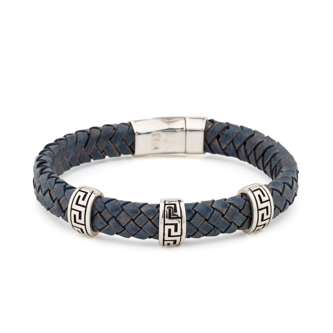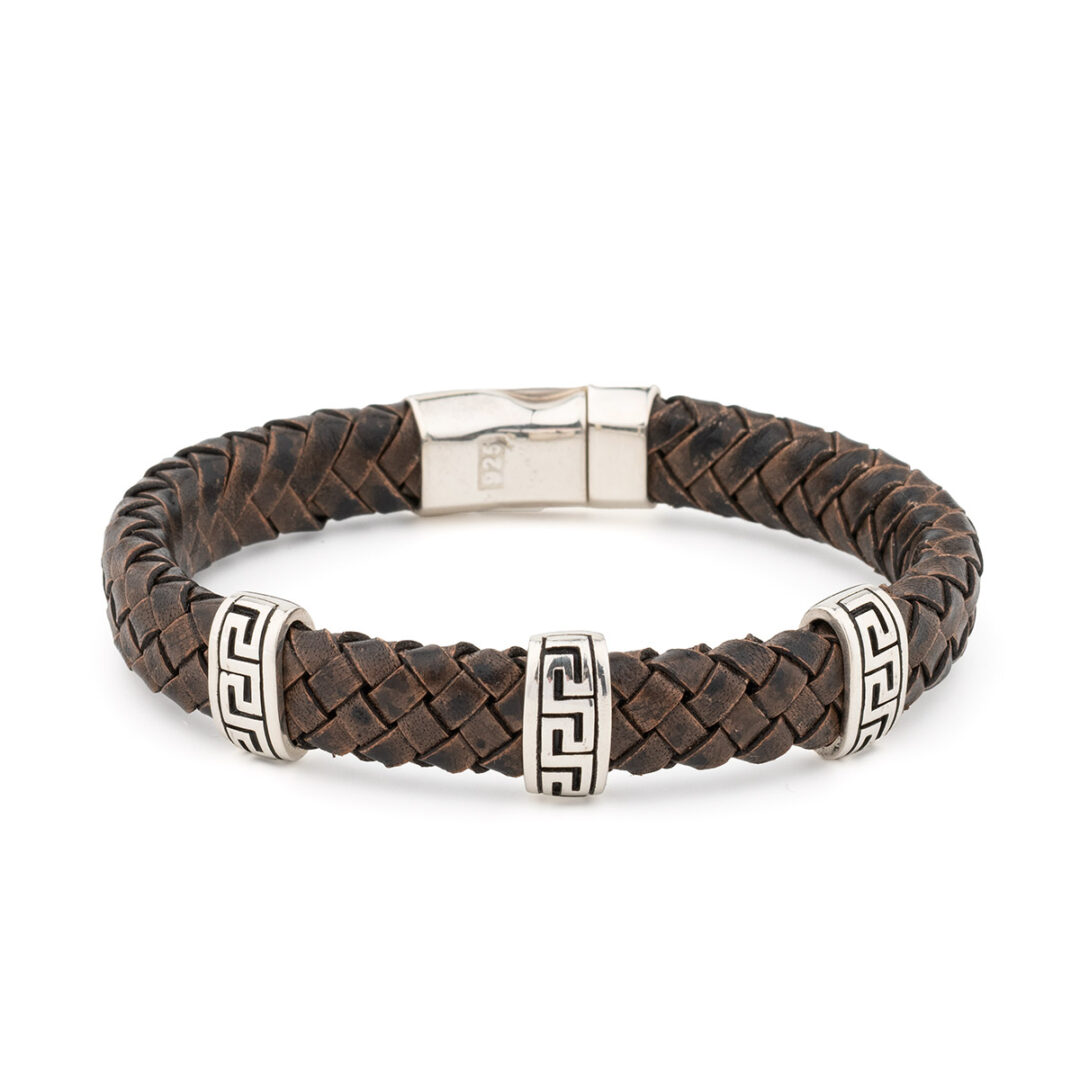 Sterling Silver Bracelet with Greek Key Motif – Genuine Leather