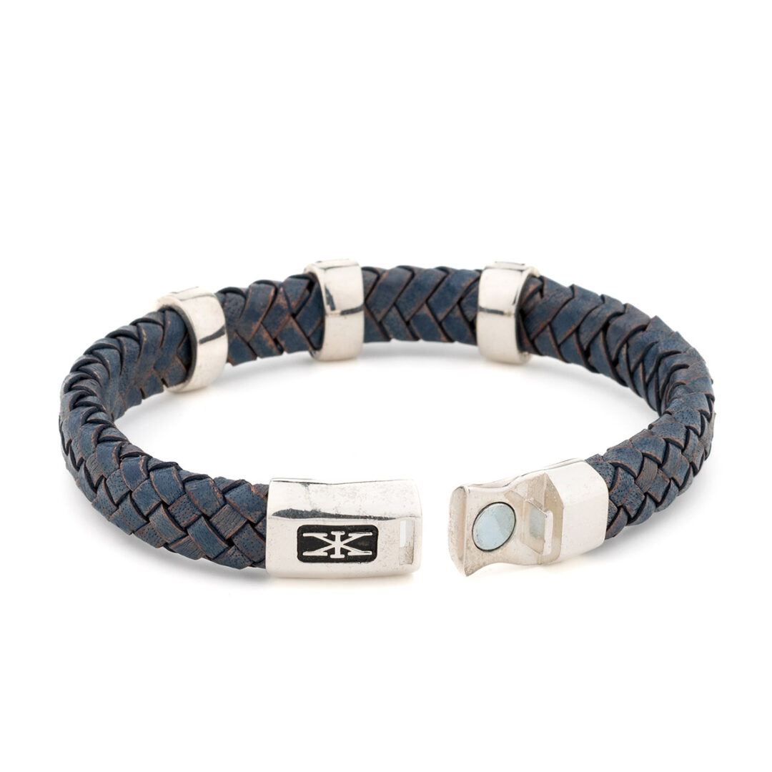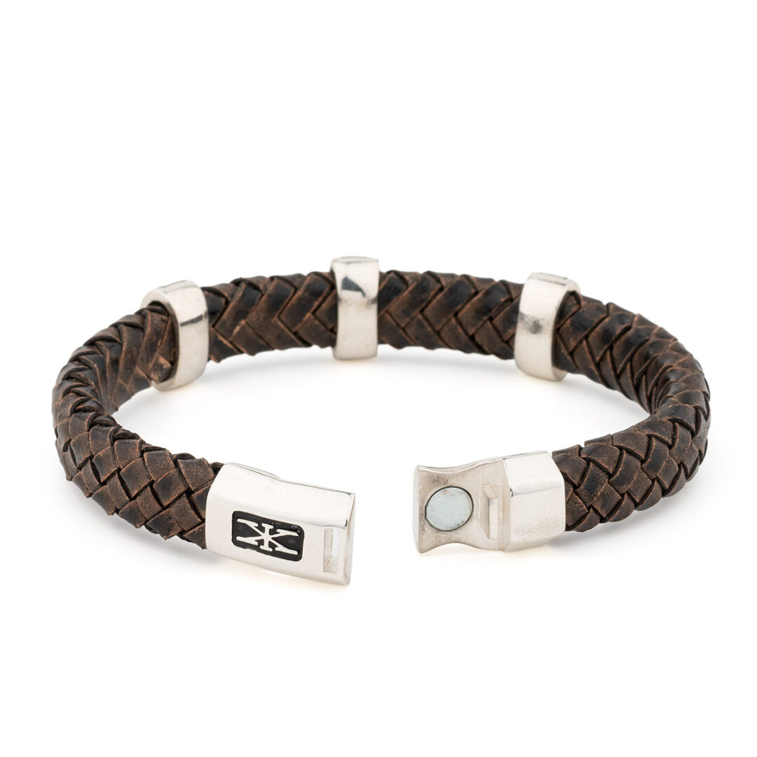 Genuine leather Sterling silver, magnetic, heavy-duty clasp.