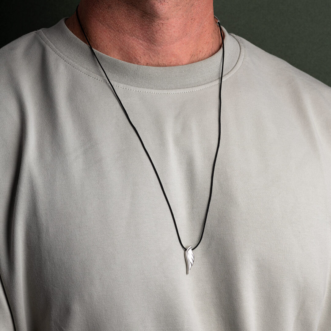 Modern handmade unisex feather pendant in oxidized and rhodium-plated 925 sterling silver.