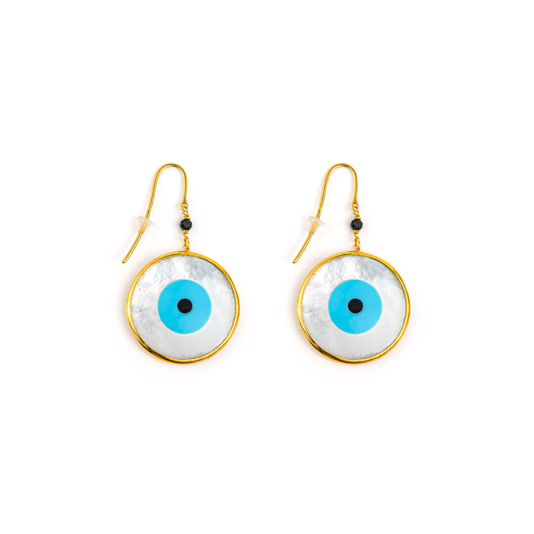 Sterling silver hook earrings with organic and mother-of-pearl evil eye in the setting.