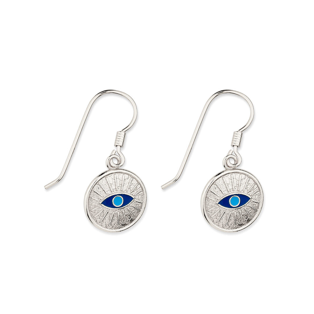 Sterling silver plated drop earrings with enamel eyes.