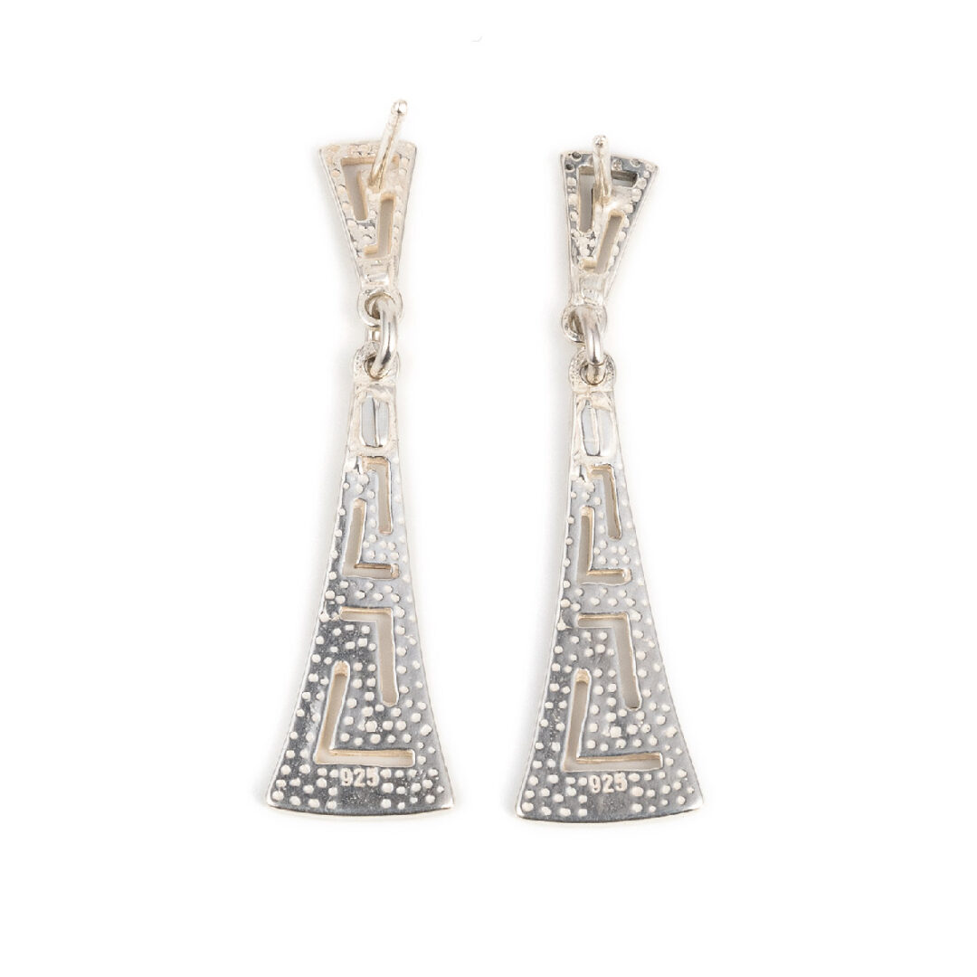 Dangle Earrings with Meander design. Meandros design is a decorative border constructed from a continuous line, shaped into a repeated motif. Such a design is also called the Greek fret or Greek key design, although these are modern designations. One the one hand, the name “meander” recalls the twisting and turning path of the Meander River in Asia Minor, and on the other hand, as Karl Kerenyi pointed out, “the meander is the figure of a labyrinth in linear form” the meaning is that these is no beginning and to end in some cases so it become the symbol of long life and eternity.