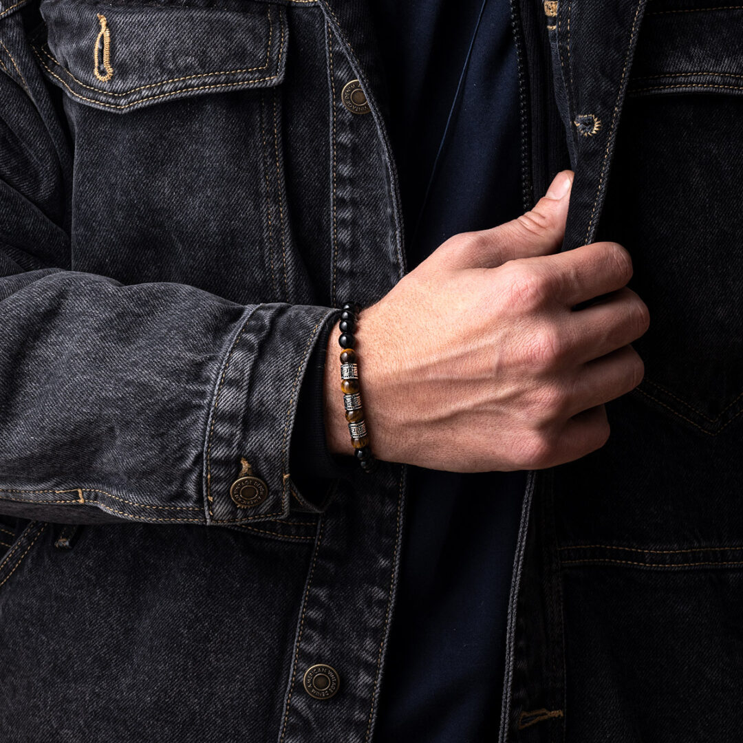 Sterling Silver bracelet with onyx and tiger eye beads.