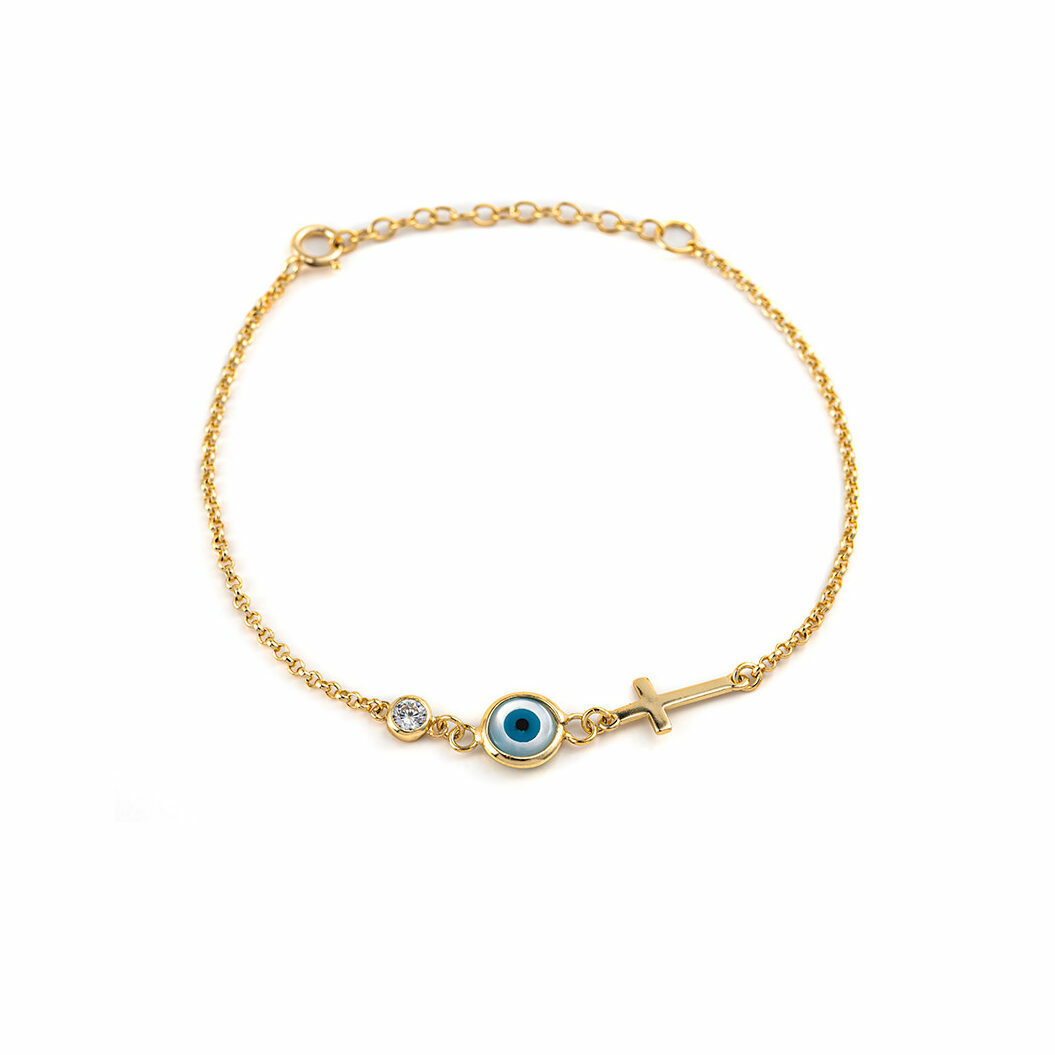 Sterling Silver Yellow Gold Plated Eye Chain Bracelet with Cross and Zircon
