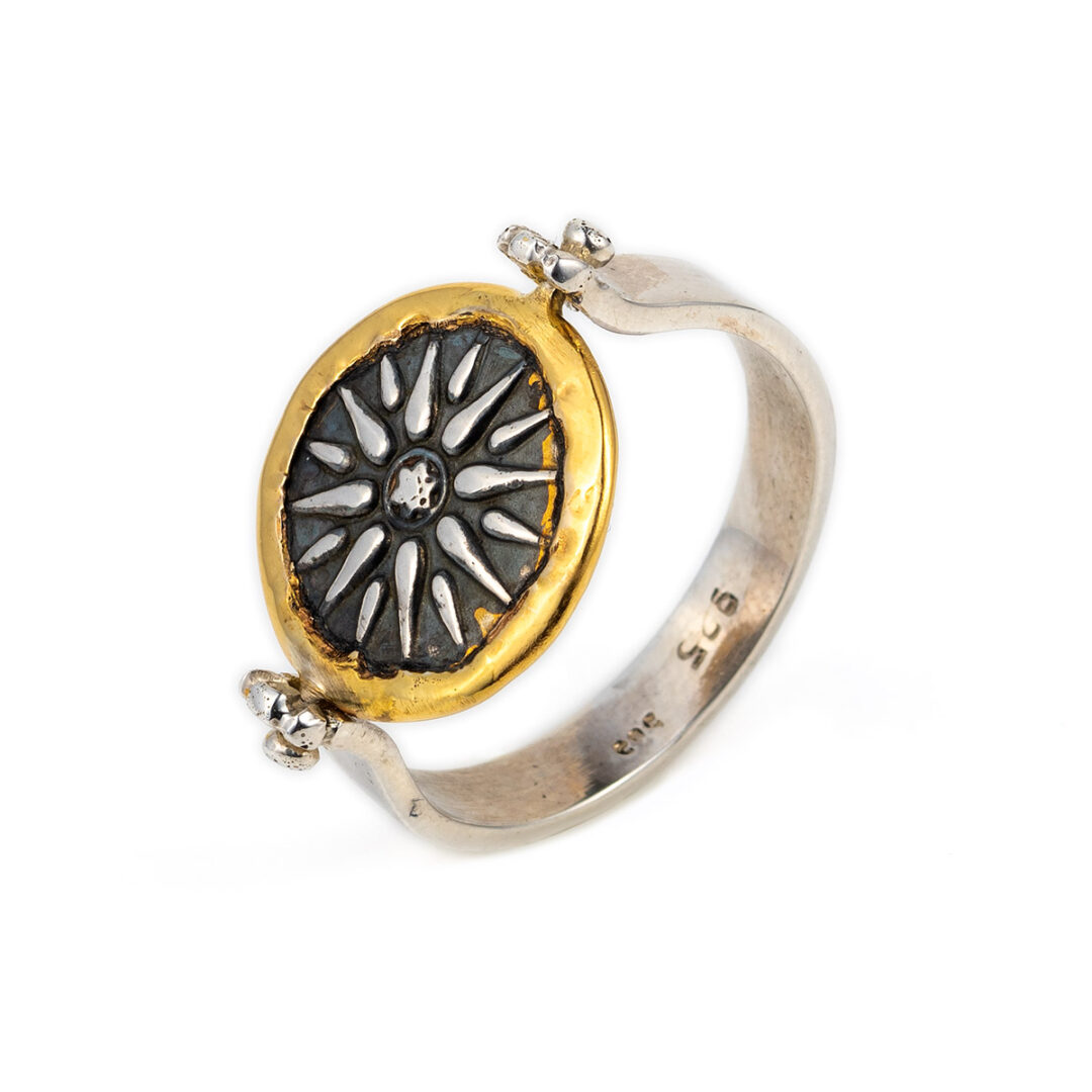 This ring inspired by the ancient Greek Vergina Sun symbol.