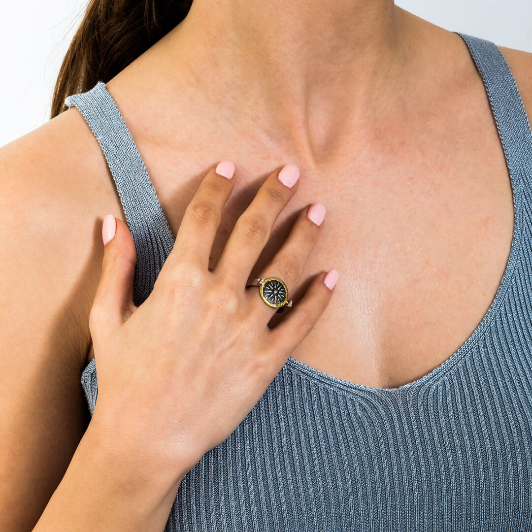 This ring was inspired by the ancient Greek Vergina Sun symbol.