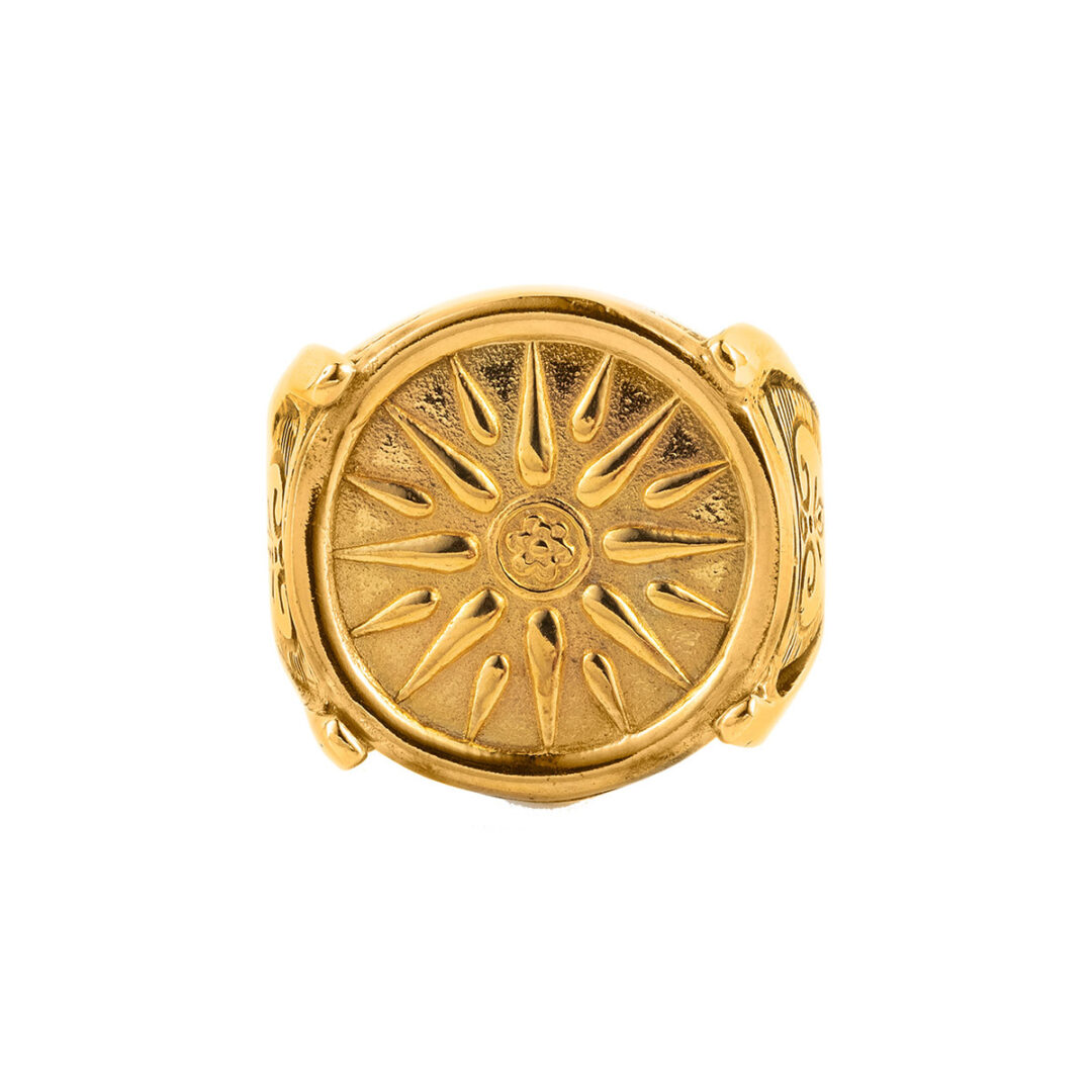 This ring inspired by the ancient Greek Vergina Sun symbol.